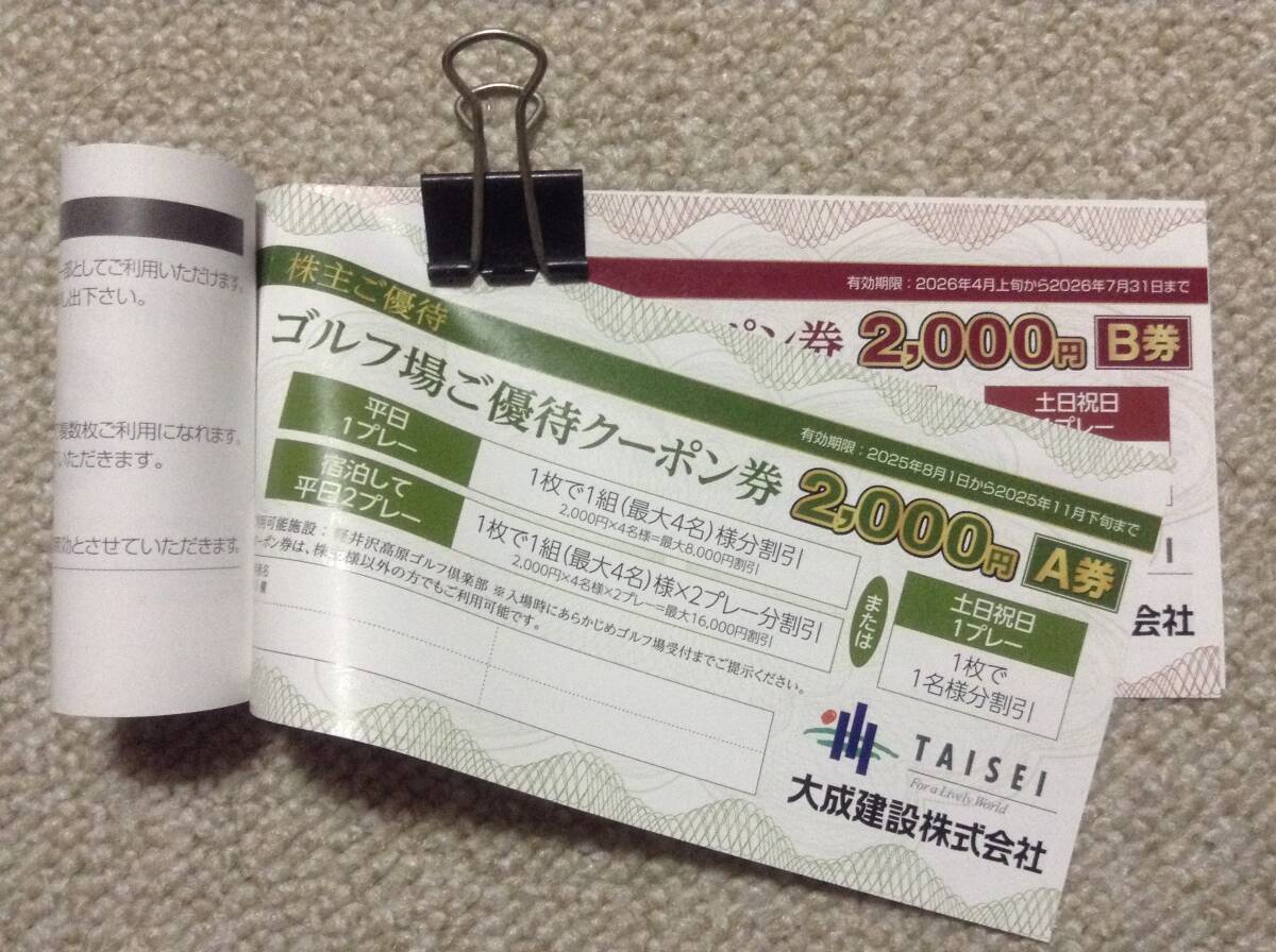 大成建設の株主優待のクーポン冊子です。クーポンは以下5枚セットの冊子です。