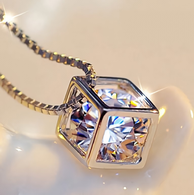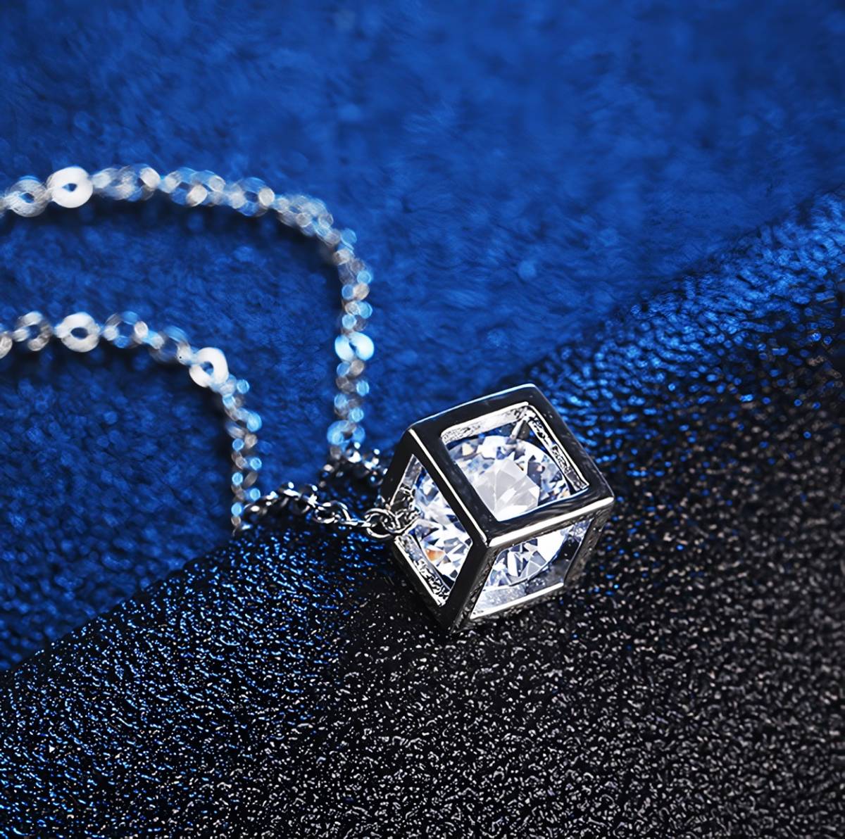 こちらキューブの中でダイヤモンドがきらりと輝くダイヤモンドプラチナ仕上げ925シルバーネックレスとなります。