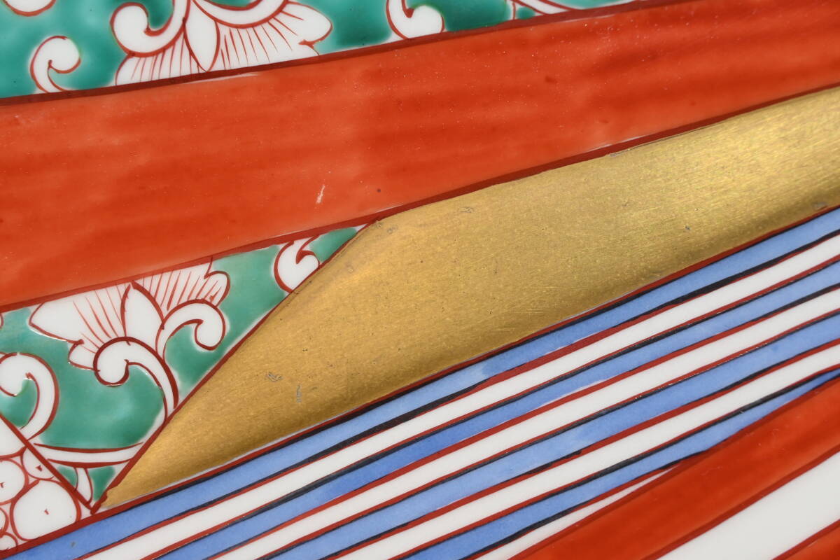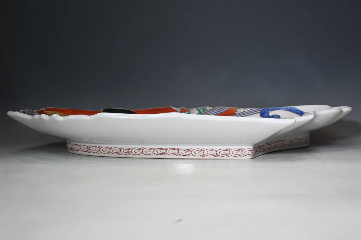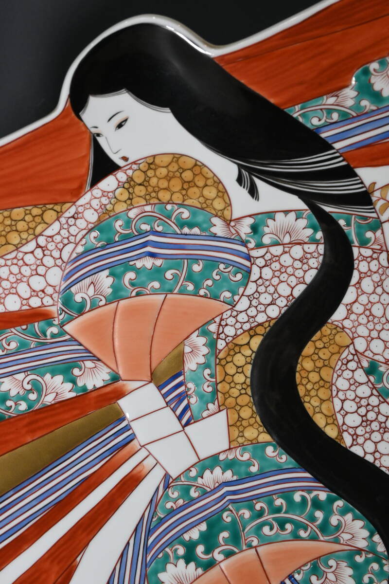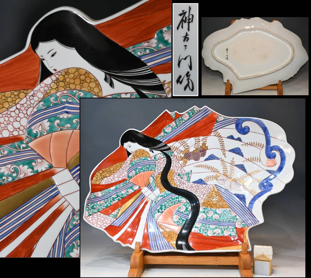 有田焼■神右衛門 作■ 染錦 古伊万里絵 姫皿 大皿 色絵金彩 皿立付 伝統工芸 幅約73cm 特大姫皿 姫形 飾皿 十二単 古美術 真作 | |||