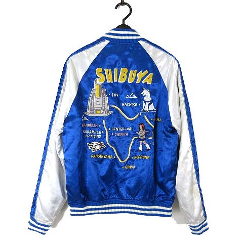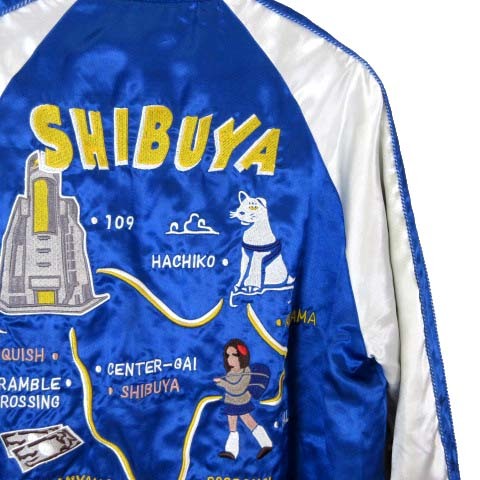 ヴァンキッシュ VANQUISH スカジャン リバーシブル MA-1 ハチ公 SHIBUYA ロゴ 刺繍 ジップアップ S 青 ブルー 白 セージグリーン