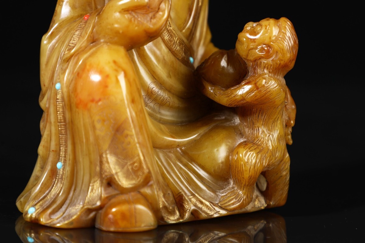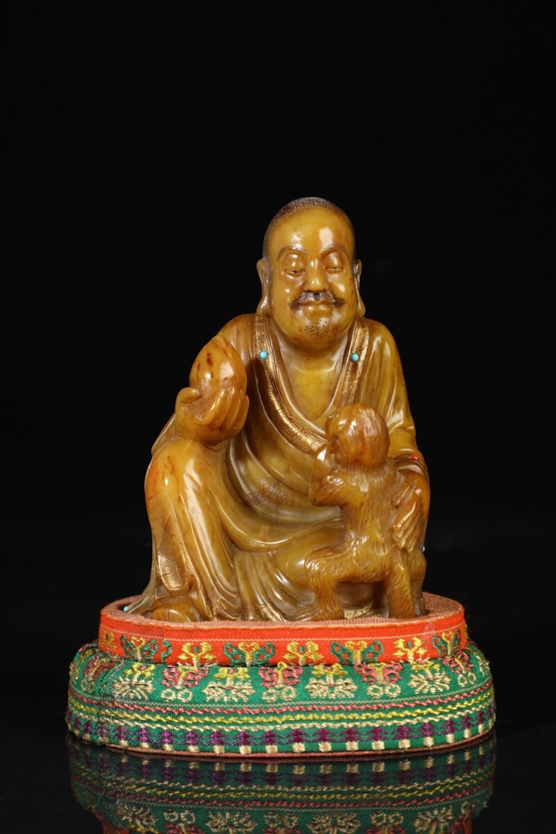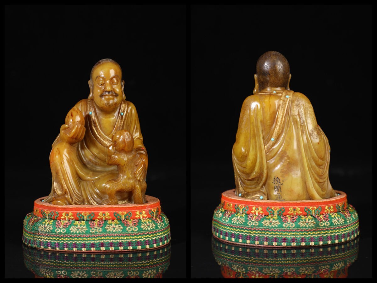 「清 魏開通 老寿山石 田黄石彫り 霊猴羅漢造像」極細工 擺件 古賞物 中国古美術 旧蔵出