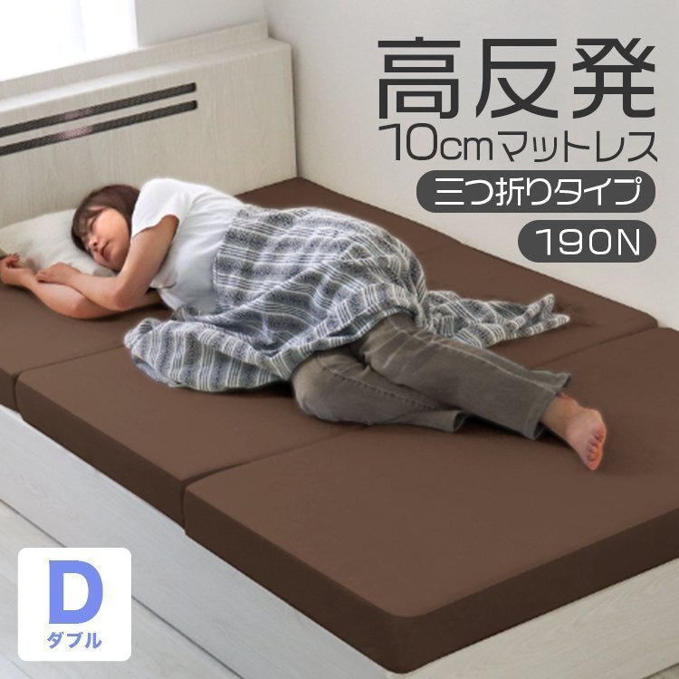 厚みたっぷり10cm! 適度な硬さで身体をしっかり支える、三つ折りタイプの高反発マットレスです。 柔らかいマットレスとは違い、身体の沈み込みを軽減した腰に優しい寝心地です。 高反発マットレスのウレタンフォームは弾性が高く、 適度な硬さで身体を支えるので、底つき感もなくへたりにくいマットレスです。 寝返りが多い方や仰向けに寝ることが多い方におススメです。 簡単にたためる三つ折りタイプなので、お部屋で立て置きして日当たりのいい場所で部屋干しが可能! 取り外しやすいL字ファスナー付き洗えるカバーが付属しています! ■商品コード:FEB004BR ■商品仕様 カラー:ブラウン サイズ(約):195cm×140cm×10cm(ダブルサイズ) 折りたたみ時:(約)65cm×140cm×30cm 重量(約):8.3kg 素材:高反発ウレタン 、パイル生地 他 硬さ:190ニュートン ■注意事項 ・圧縮梱包されたままの状態で長期間保管した場合、マットレスが復元できなくなってしまいます。 商品到着後、1週間以内に必ず圧縮から開放をして頂くようにお願いいたします。 ・マットレスは約1-2日で復元します。気温や温度により3-14日かかる場合もあります。 ・製品の臭いが気になりましたら、風通しの良いところで脱臭してください。 この臭いは素材のウレタンによるもので無害です。臭いに敏感な方は十分ご検討の上、ご購入をお願いいたします。 ・マットの硬さは温度によって変わってきます。また、硬さの感じ方には個人差があります。 ・カバーは取り外して洗濯ができますが、マットレス本体は洗濯しないでください。 ・生産ロットによって復元率・ニュートンに差異が生じる場合があります。 ・商品は、モニターによって色合いが異なって見える場合があります。 ・仕様・デザインは改良のため予告なく変更することがあります。 ■保障期間 7日間 ※商品到着後7日以内の初期不良・破損のみご対応させていただきます。 【新品未使用品です】 |