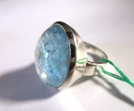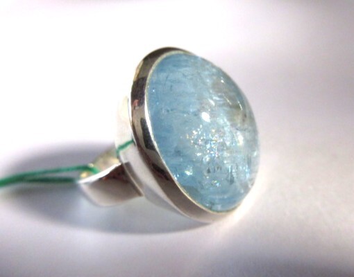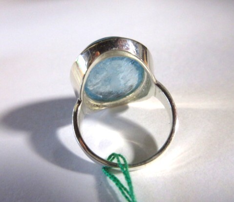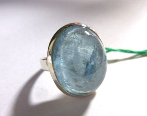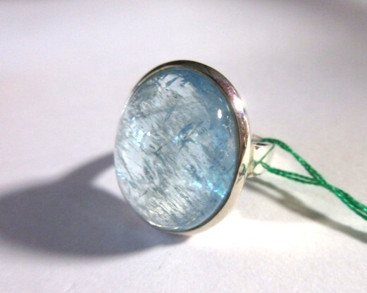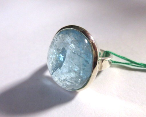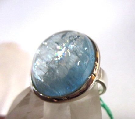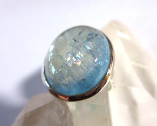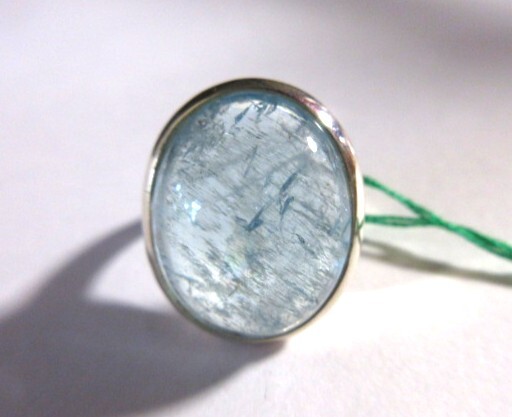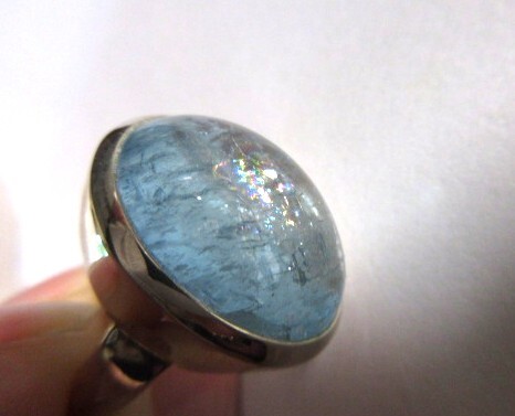 明るい水色のアクアマリン・カボーションです。斜め方向ですが、レインボーが出ている部分があります。インクルージョンがありますが、透明感とテリがあります。非加熱。