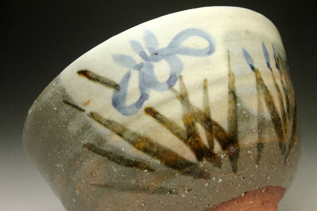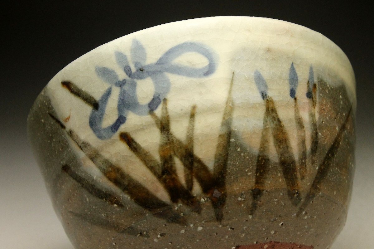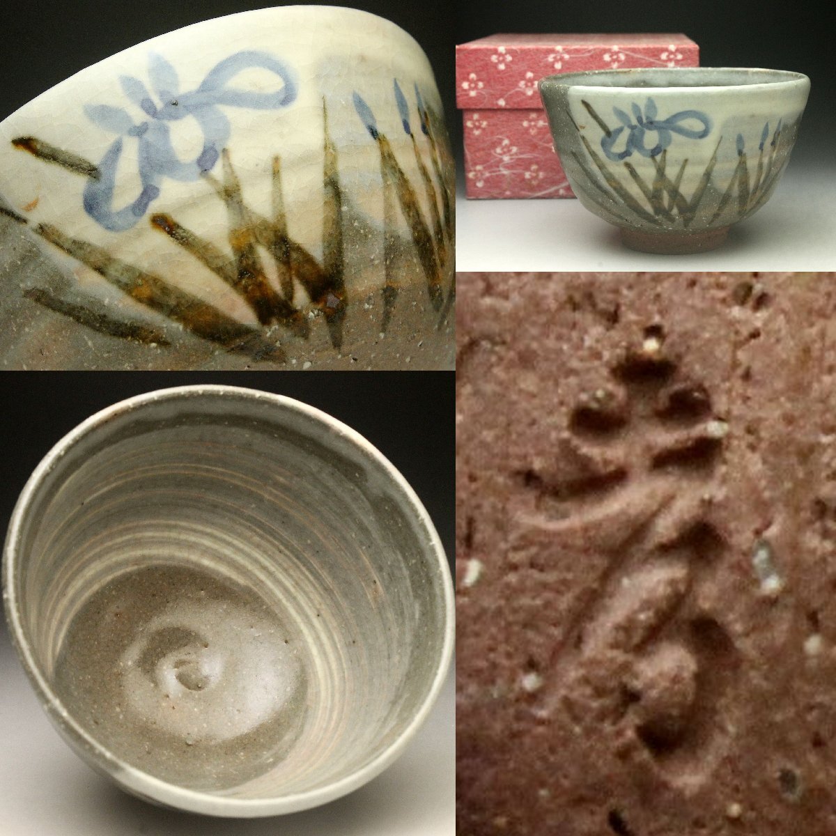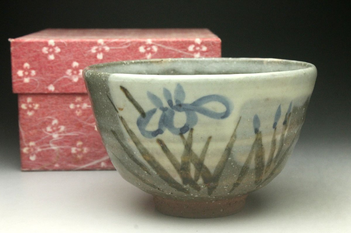 【余韻】 清水焼 京焼 作家物 孝銘 色絵 菖蒲文 茶碗★抹茶碗 化粧箱 無傷美品 茶道具<同梱可>