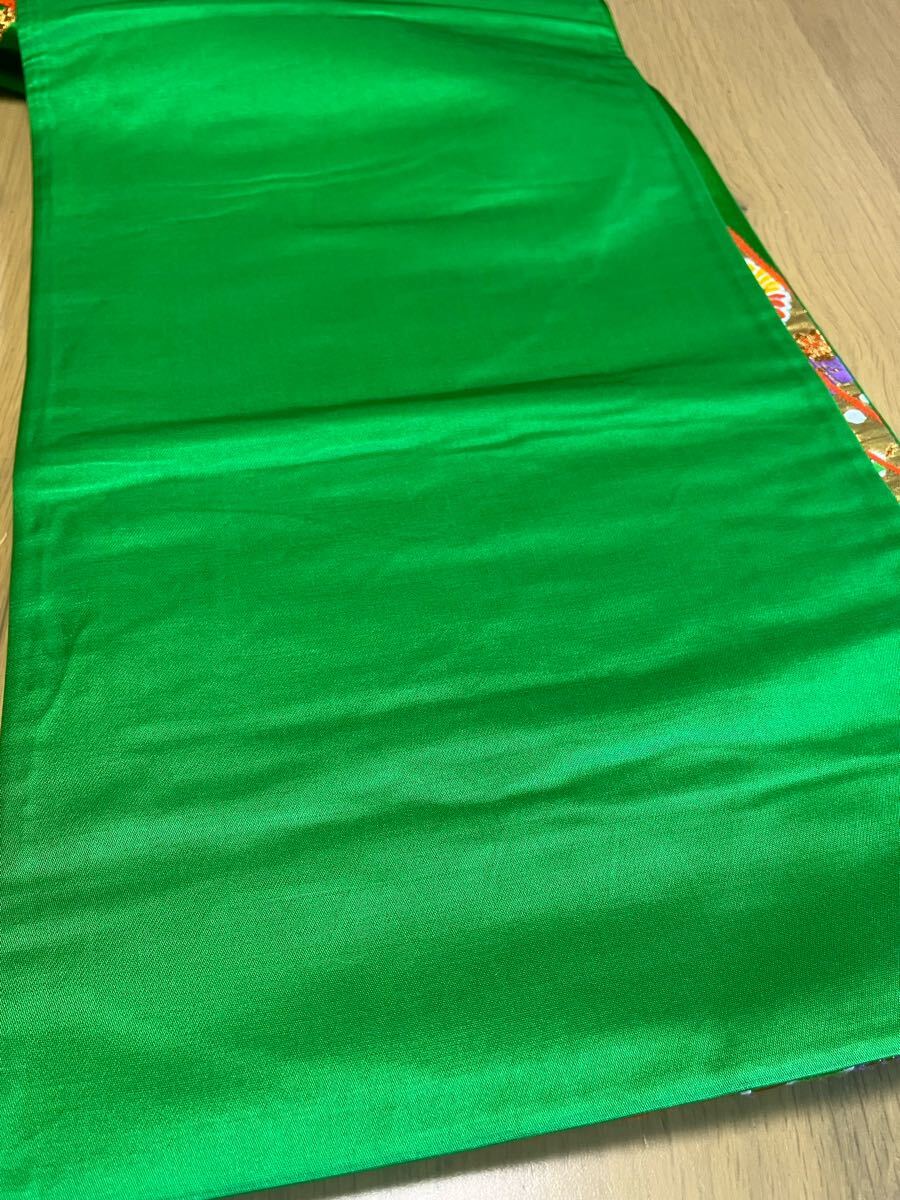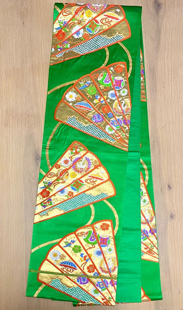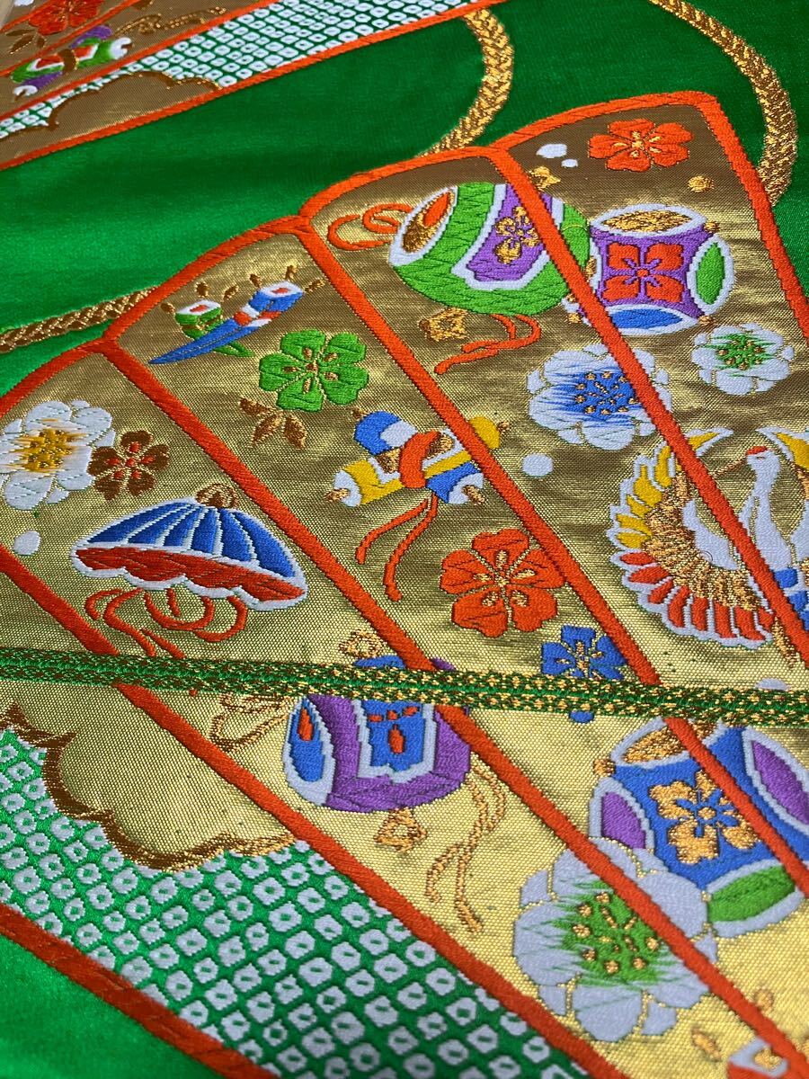 緑の地に、金糸使いの檜扇に宝尽くしの織り柄です。