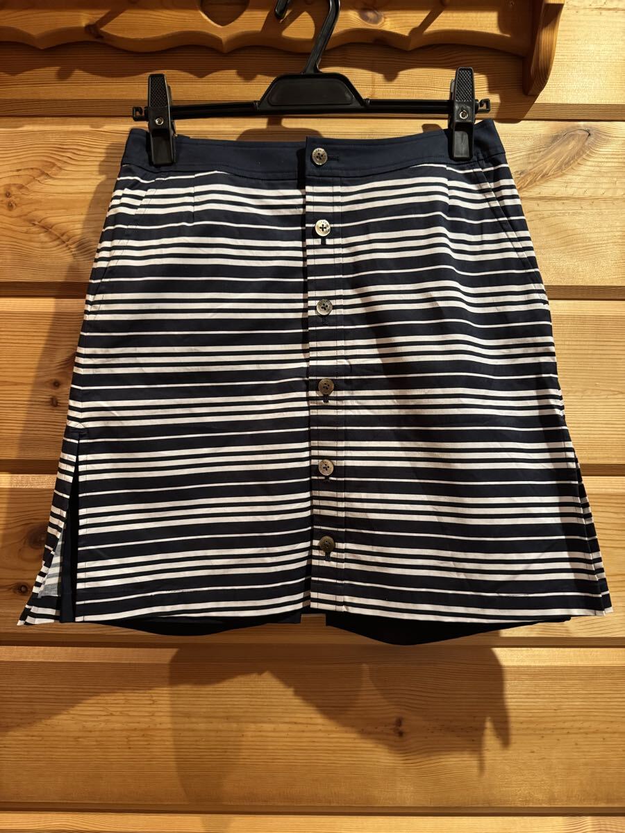 サイズは7  ウエストは平置き寸法でパンツが約68㌢ スカートが約72㌢ お色は紺色