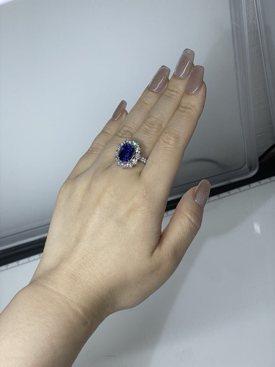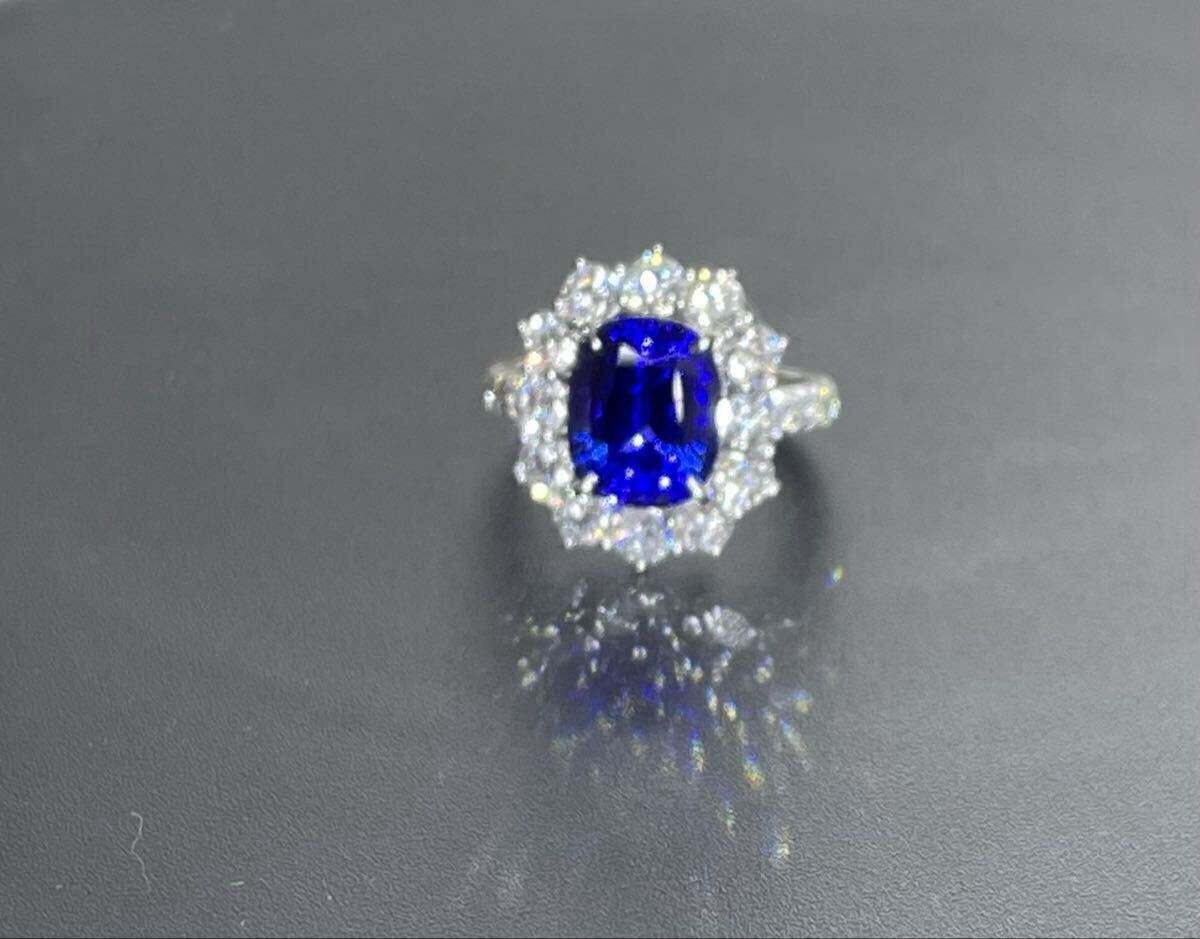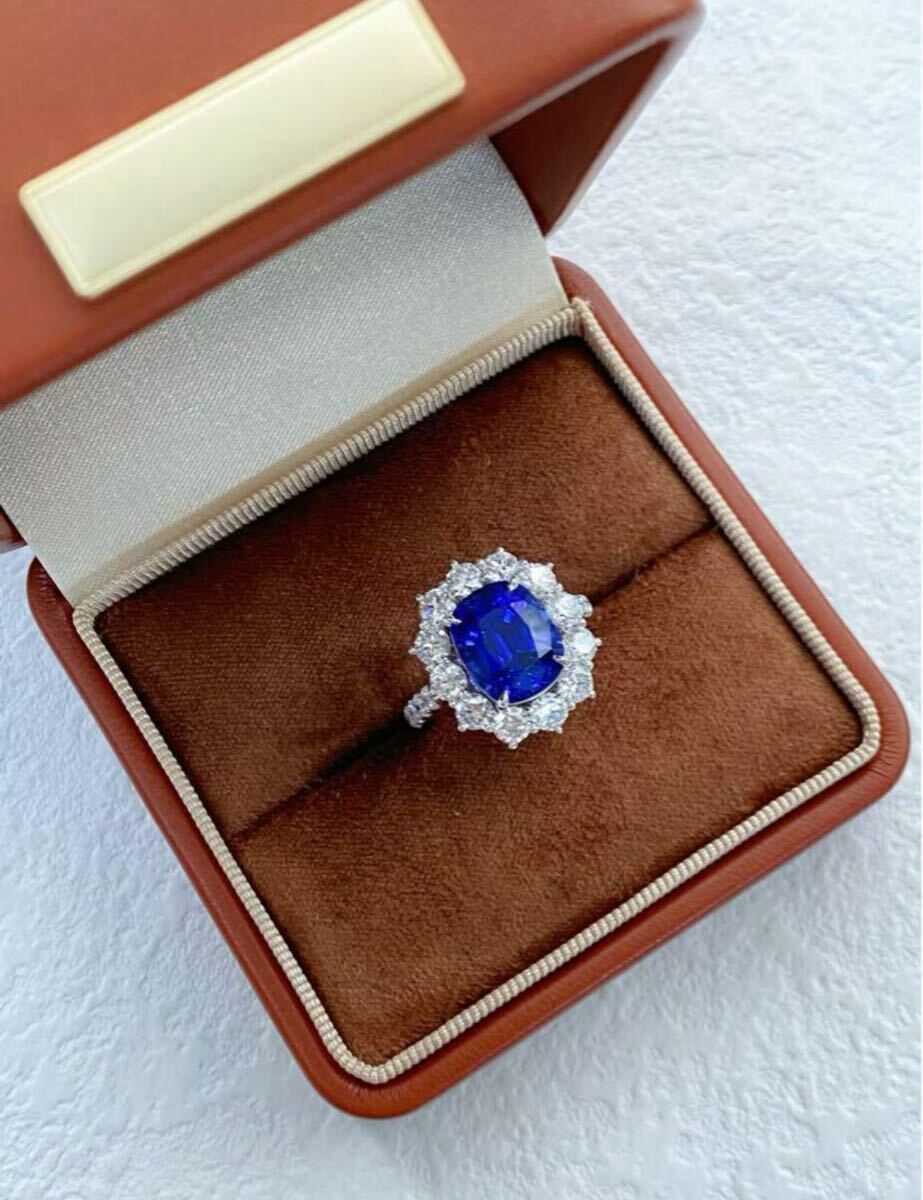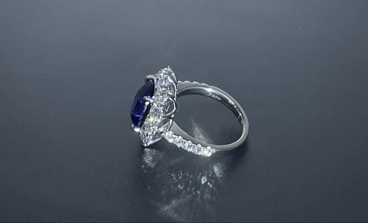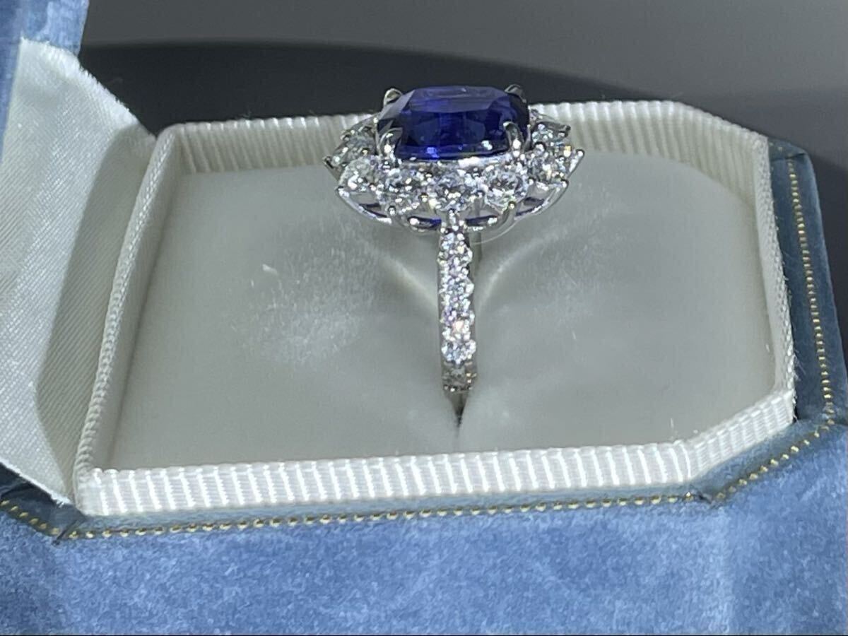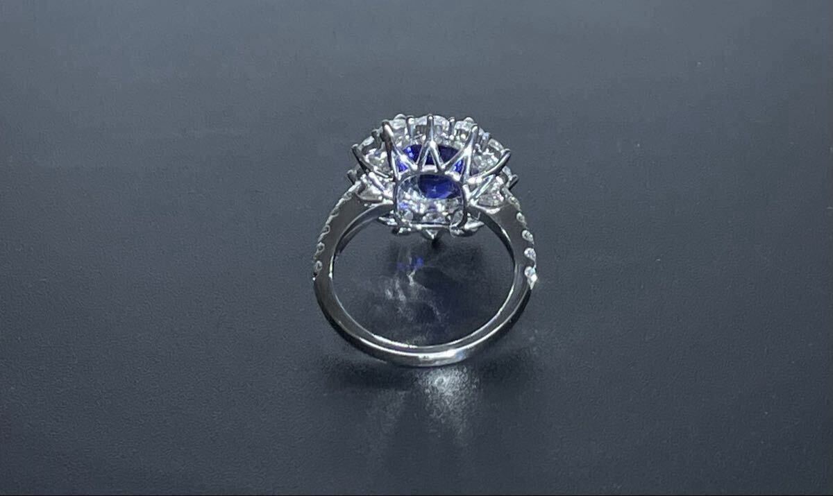 センターには 5.13カラットのロイヤルブルーサファイアを配置し、周囲を合計 2.069カラットの天然ダイヤモンドで囲んだ、華やかでバランスの取れたデザインです。