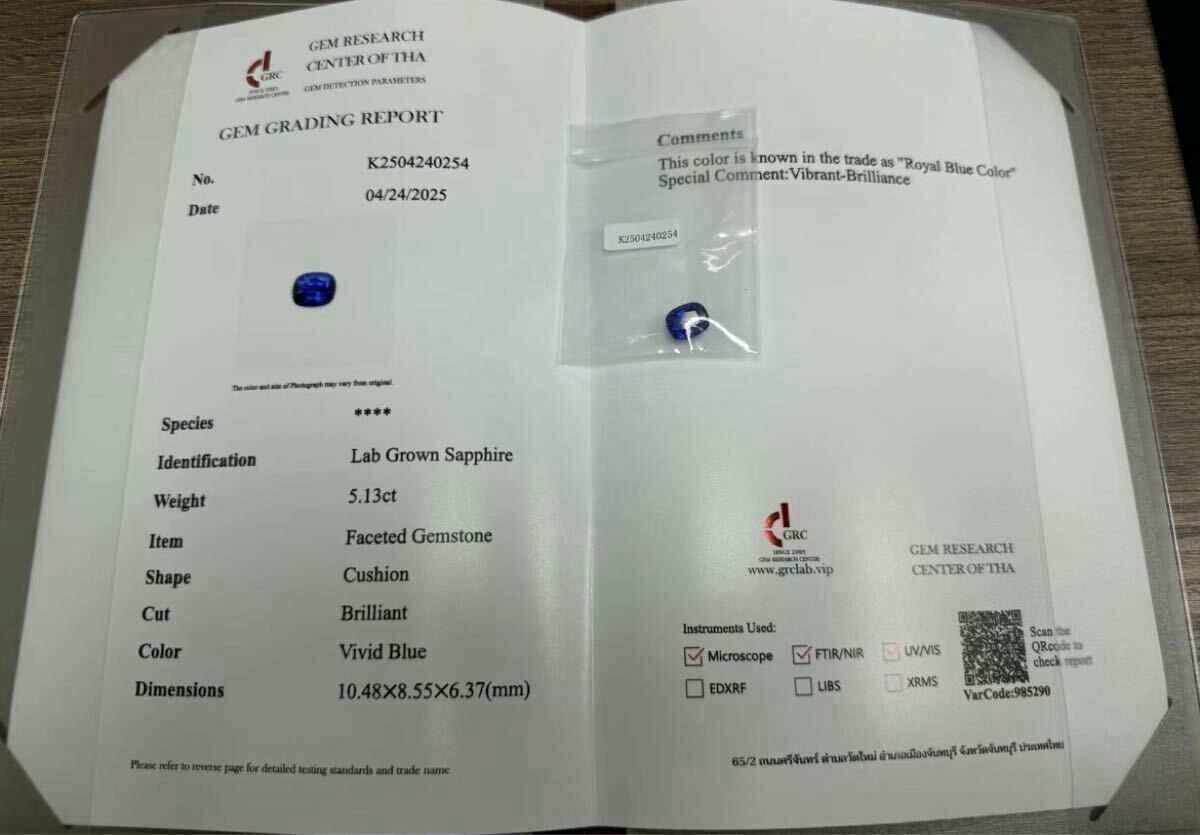 GRC鑑別書にて正式にラボグロウンサファイアであることと、ロイヤルブルー(Vivid Blue)であることが確認されており、美しく深いブルーと高い透明度を兼ね備えています。