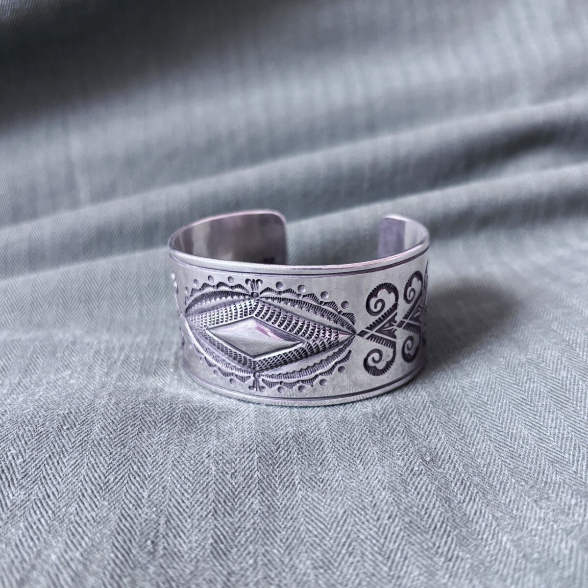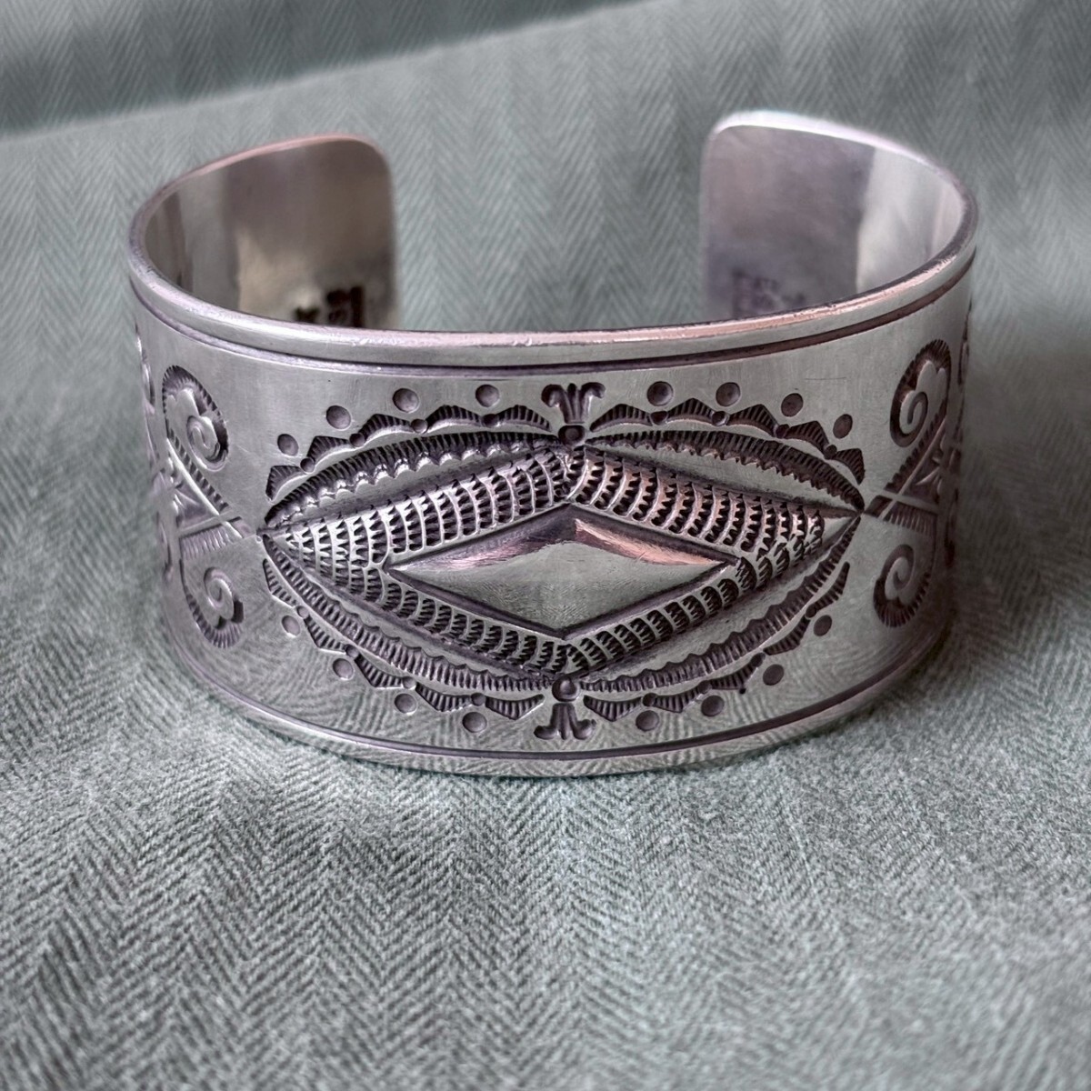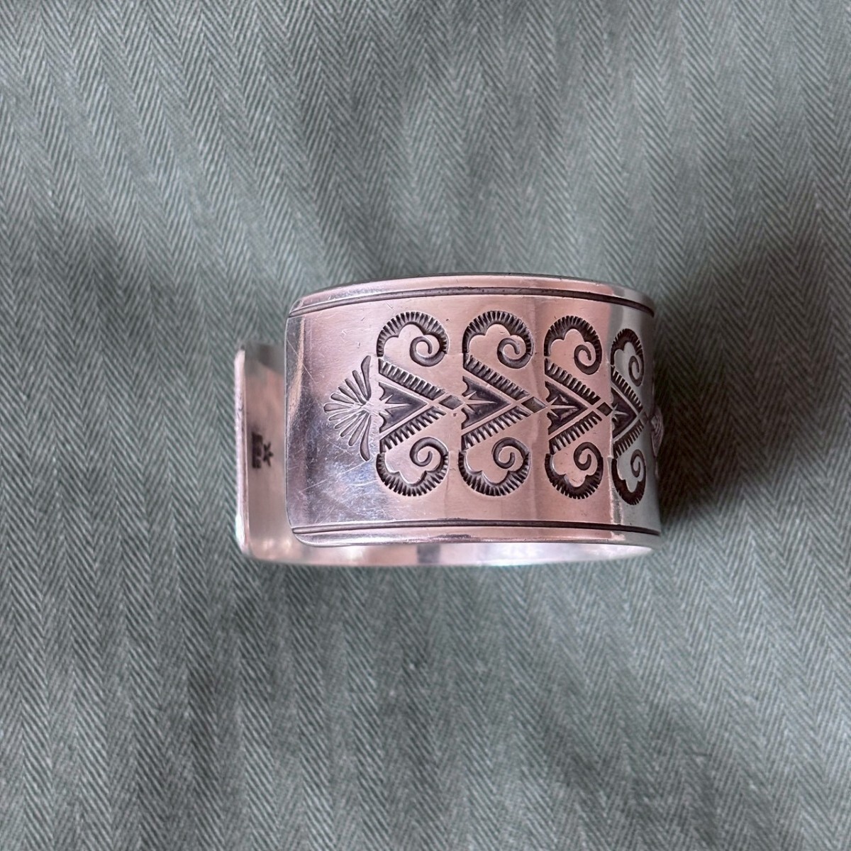 氏は1950年生まれのナバホ族シルバースミスで、伝統技術を継承しながらも独自の重厚感と緻密なスタンプワークで知られる名工です。彼の作品はアメリカ国内でも評価が高く、近年では入手困難となっています。