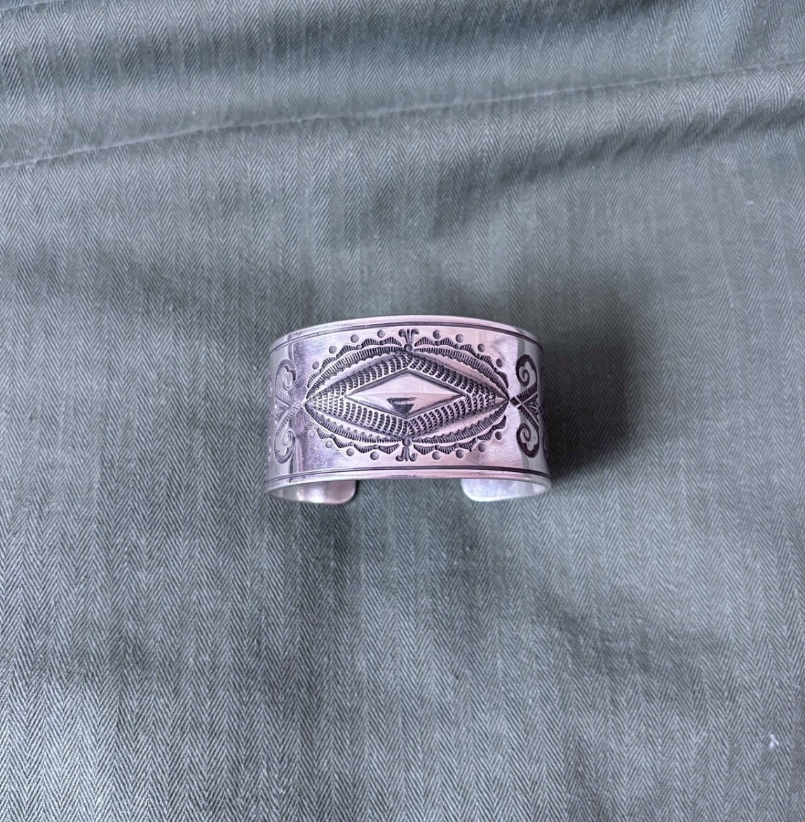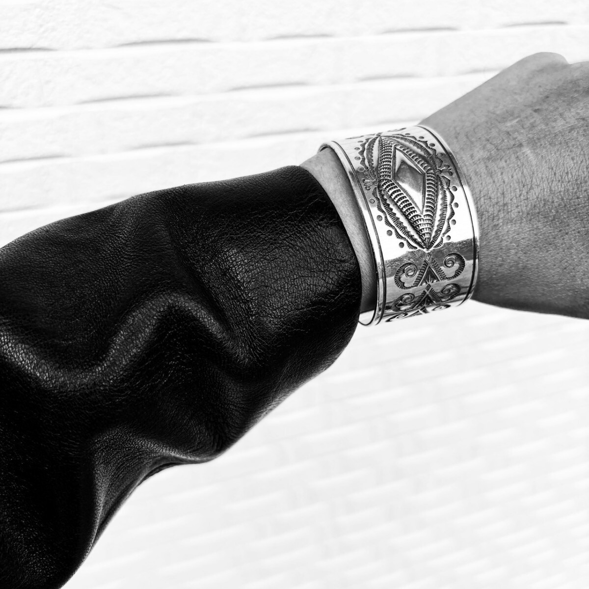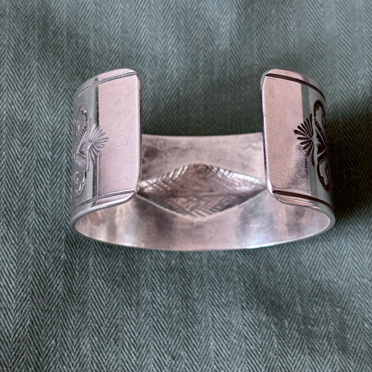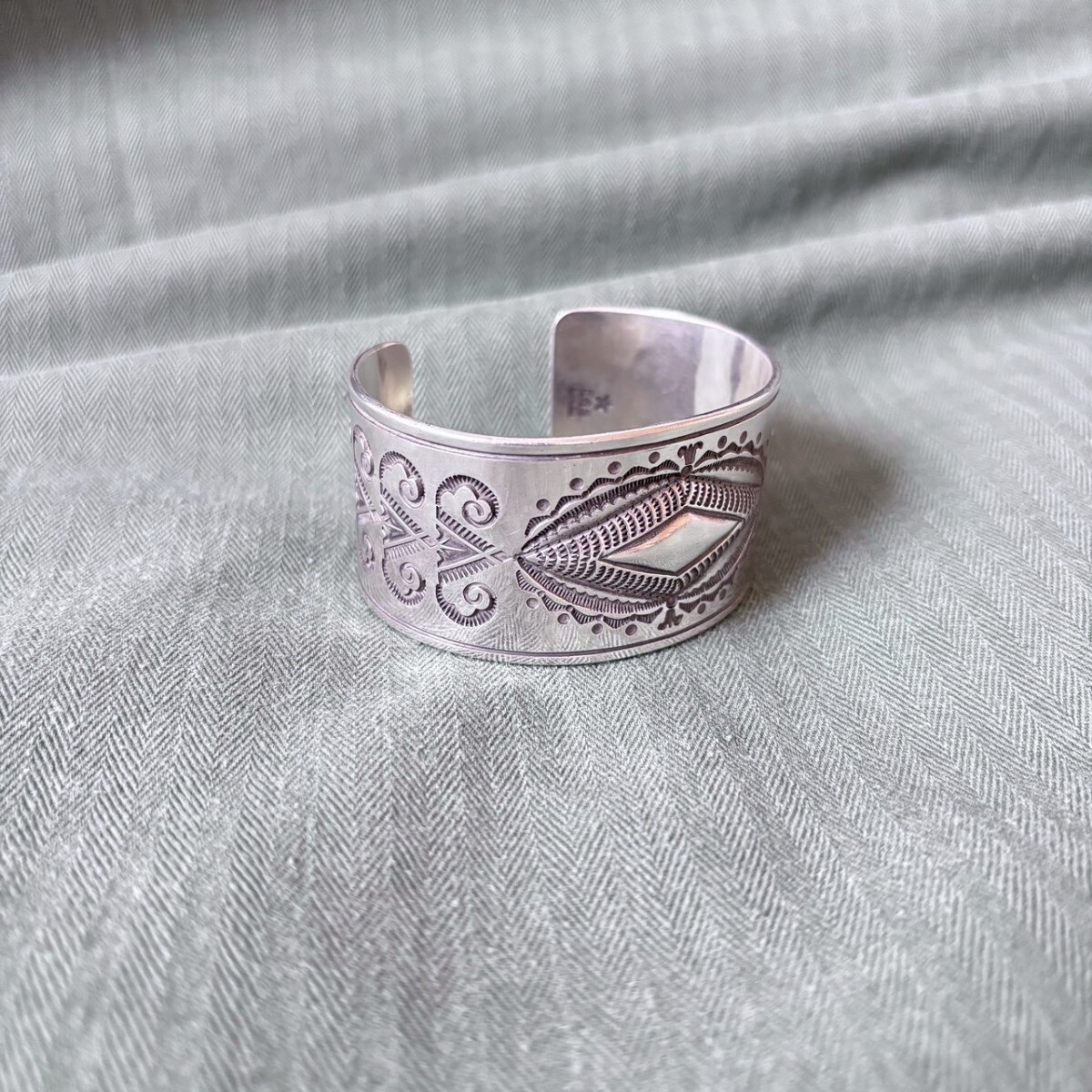 氏は1950年生まれのナバホ族シルバースミスで、伝統技術を継承しながらも独自の重厚感と緻密なスタンプワークで知られる名工です。彼の作品はアメリカ国内でも評価が高く、近年では入手困難となっています。