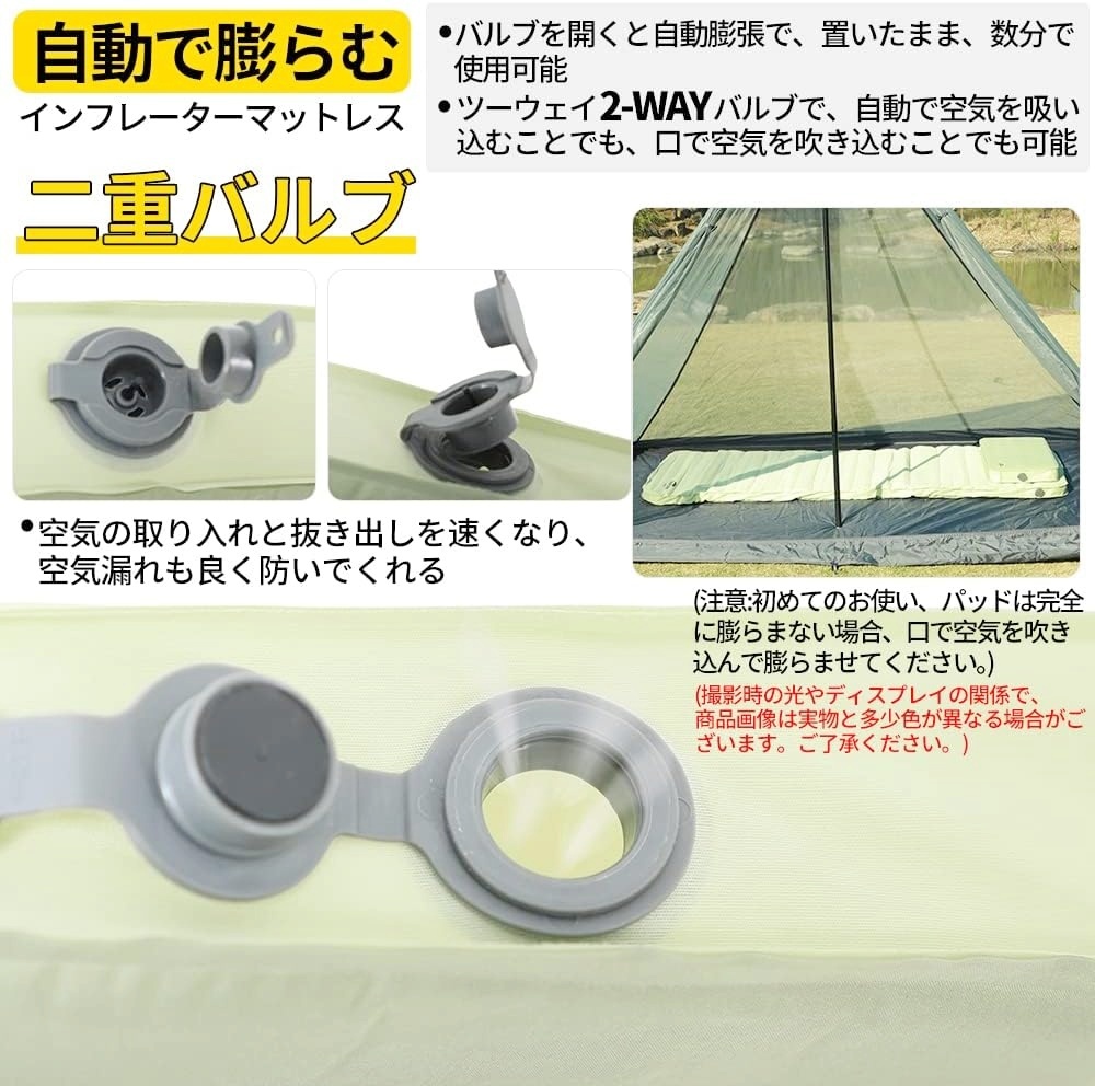 • 二重バルブ付き自動膨張式:収納バッグから取り出し、バルブを開いて置くままで自動的に膨らませることができ、すごく扱いやすいタイプです。