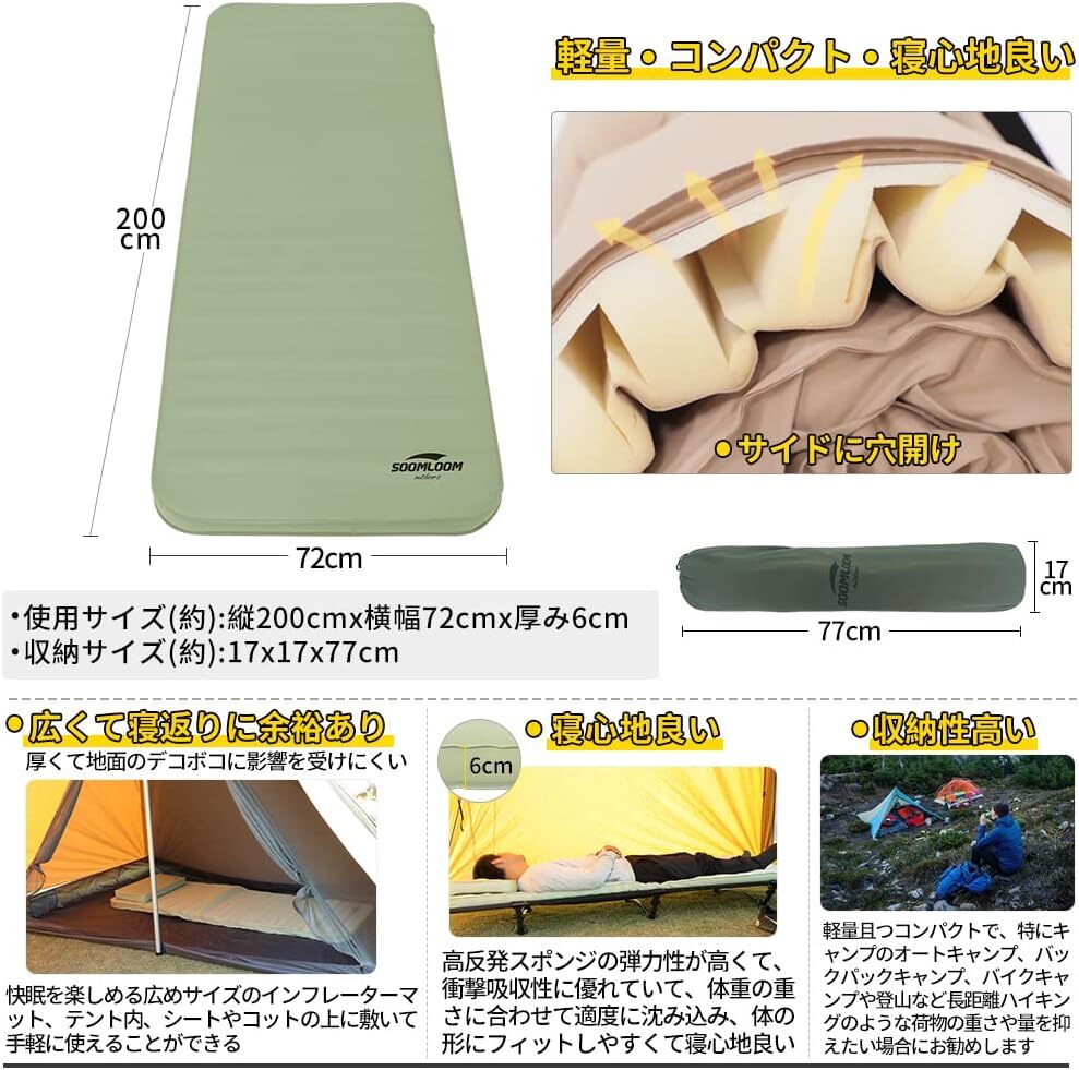 • サイズ:使用サイズ(約)縦200cmx横幅72cmx厚み6cm、広くて寝返りに余裕あり、厚くて地面のデコボコに影響を受けにくくて、テント内、シートやコットの上に敷いて手軽に使える広めサイズです。収納時(約)17x17x77cm、非常にコンパクトサイズに抑えられます。