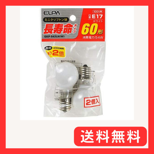 「エルパ(ELPA) 長寿命ミニクリプトン球 電球 照明 間接照明 E17 54W ホワイト 2個入 GKP-542LH(W)」▼4901087192373▼(商品説明)・ホワイト 60W 2個 GKP-542LH(W)・定格電圧:100V・定格電力:54W・定格寿命:4 000時間・本体サイズ:全長67×バルブ径35(mm)・口金E17 入数:2個 カラー:ホワイト説明 商品紹介 ●60形長寿命タイプ ●寿命は約2倍の4 000時間(当社比) ●アルゴンガスよりも熱伝導率の低いクリプトンガスの封入で長寿命を実現した電球です。外径のコンパクト化によってスポットライト、ダウンライトなど幅広く使用できます ご注意(免責)>必ずお読みください ●口金のサイズをご確認下さい。