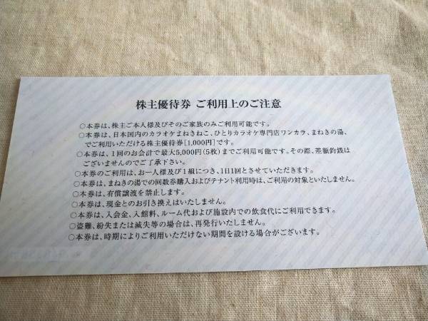 ●全国のカラオケまねきねこ まねきの湯で使えるコシダカホールディングス株主優待券、 1000円分 ×5枚 5,000円分