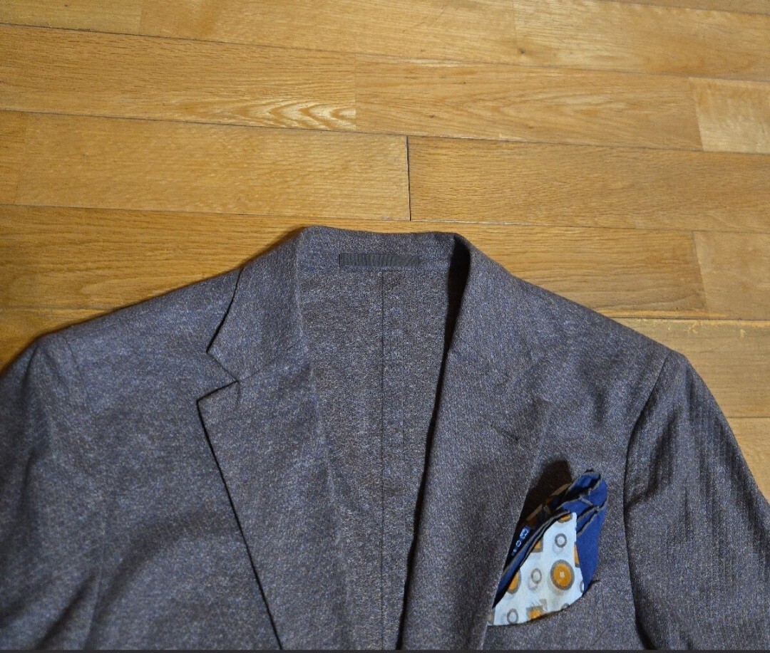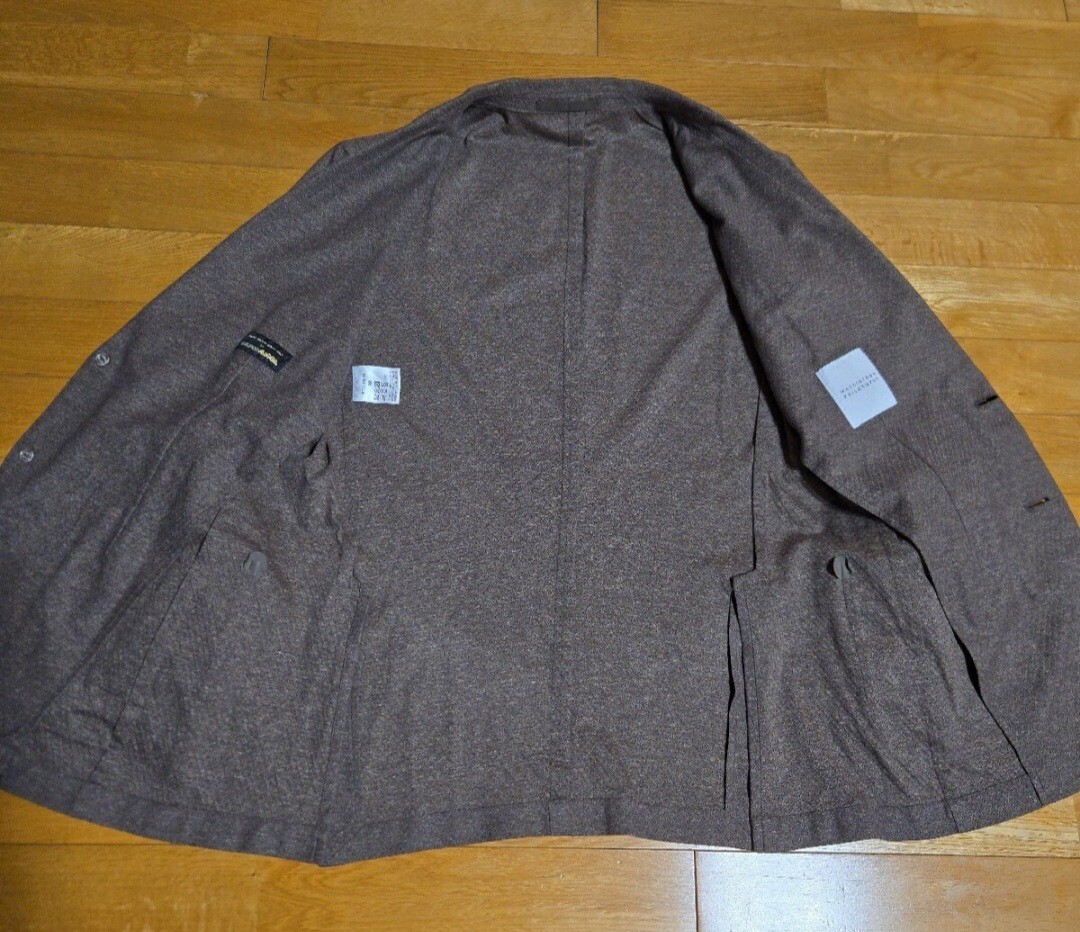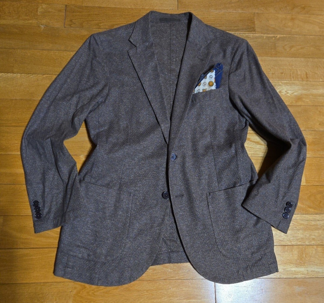 佇まいが素晴らしい柔らかでやや起毛感のある快適な生地、MAGLIFICIO MAGGIA社の『ジャガード調織りライトフラノコットン』ニット調のブラウン地、独特の質感と軽やかな英国的な秋口生地が特徴的です、また裏地はアンコン仕様の軽く羽織れます素材を採用したジャケット。シルエットは英国調の極上定評の定番モデルの美シルエット、特別なややストレッチ生地を使用した極上の質感と洗練された雰囲気がある英国調テーラードジャケットです。