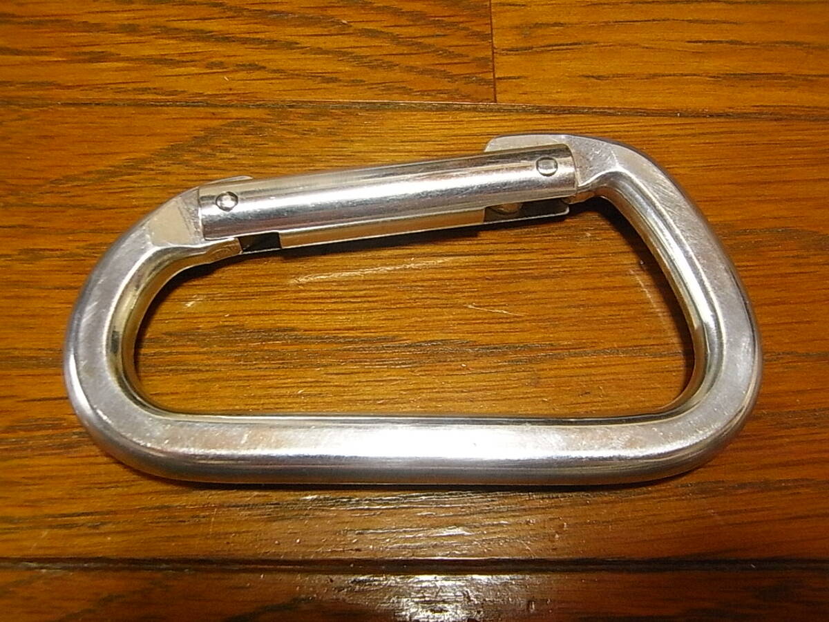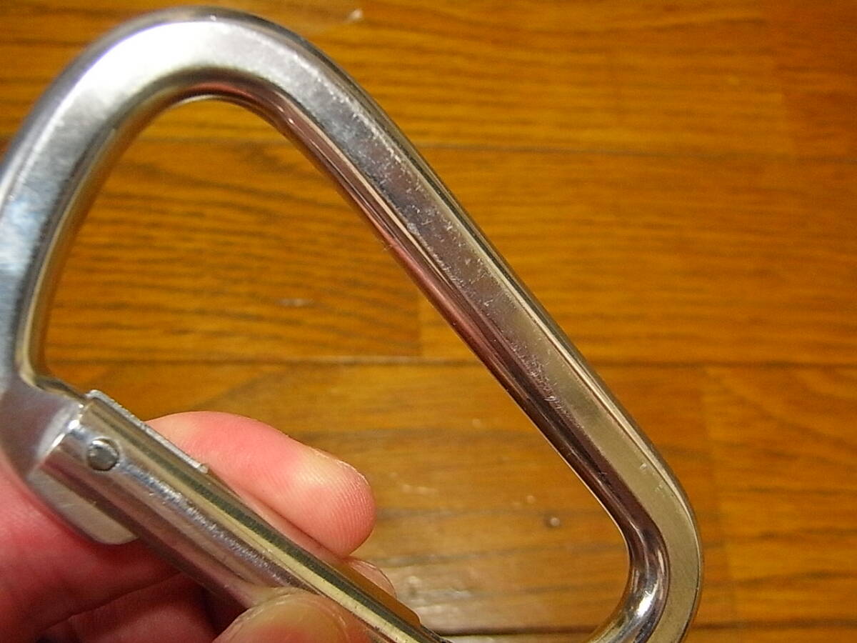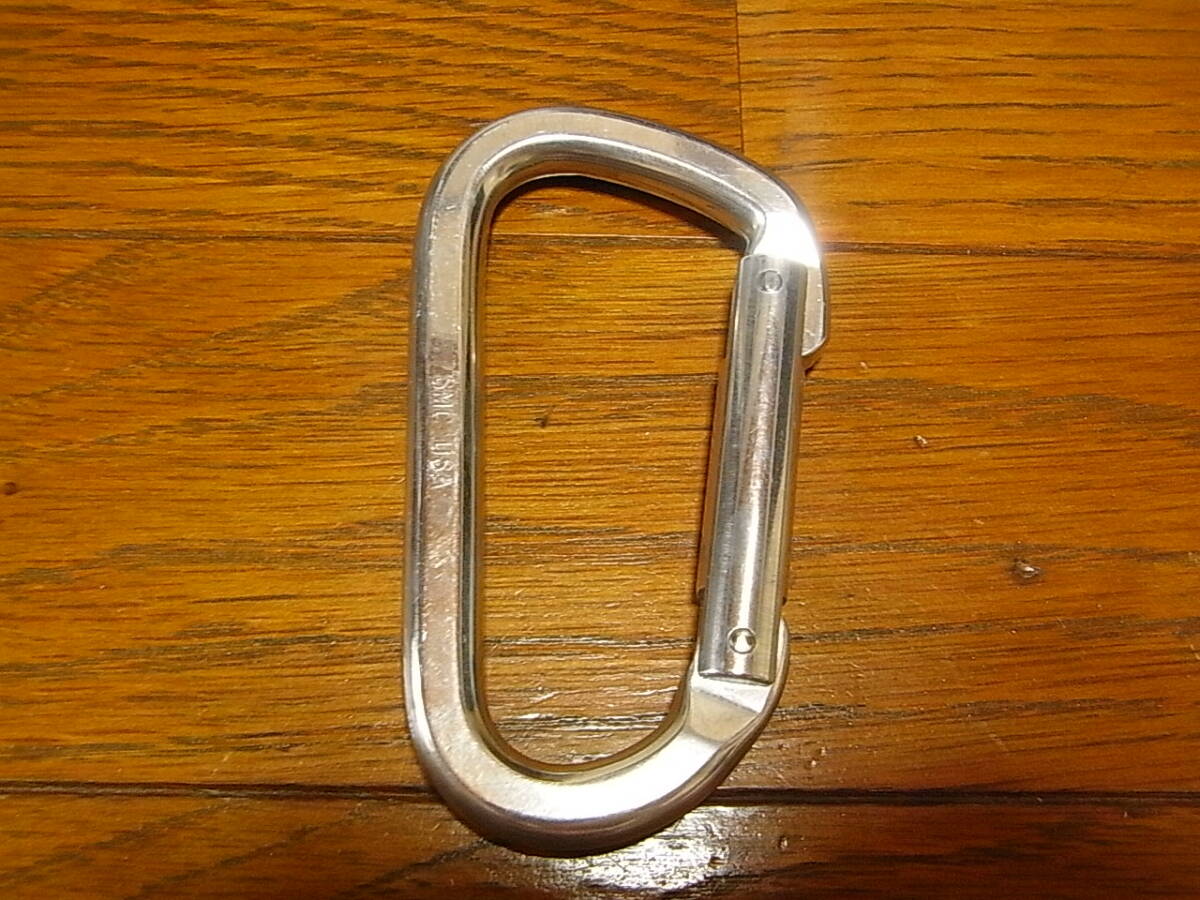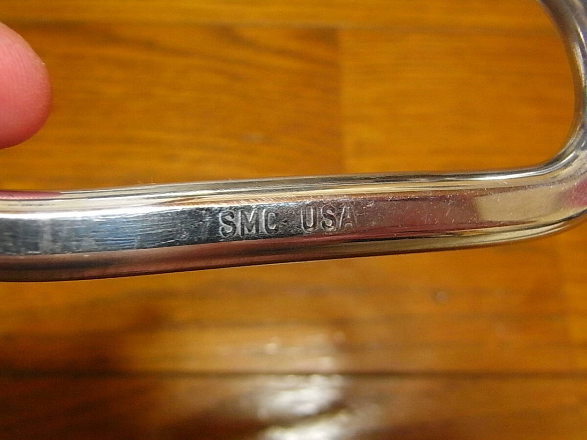 SMCのカラビナは裏面に荷重強度の数値が初期からある時期までずっと表記がないのですが、他のブランドのクライミング用のカラビナとそこまで変わらないと思います。このカラビナはSMCのロゴがエンボス(初期のものは刻印)なので90~00年代くらいのものだと思います。