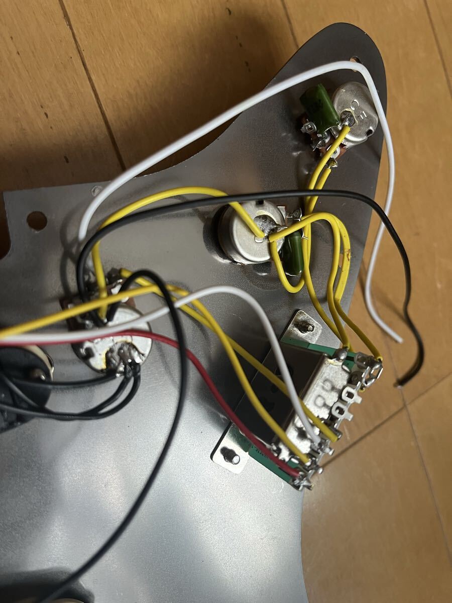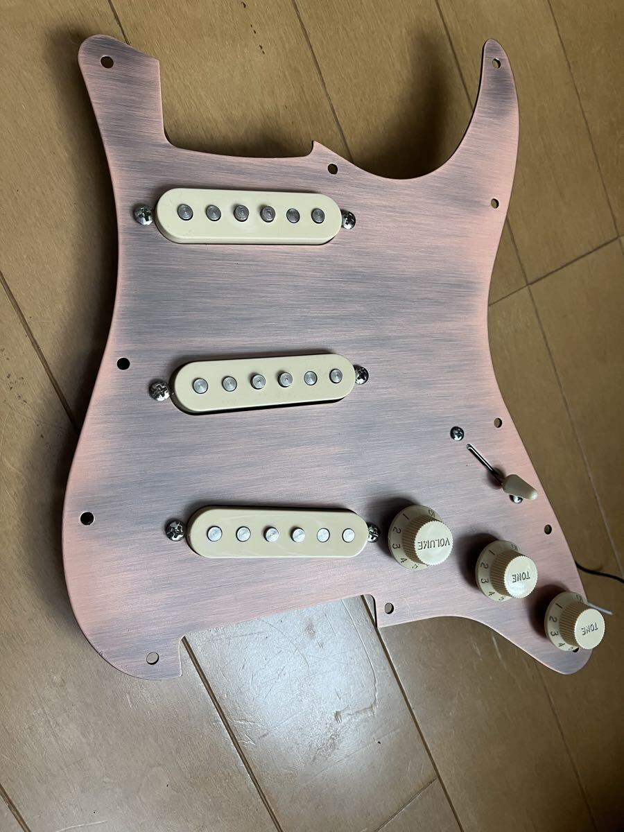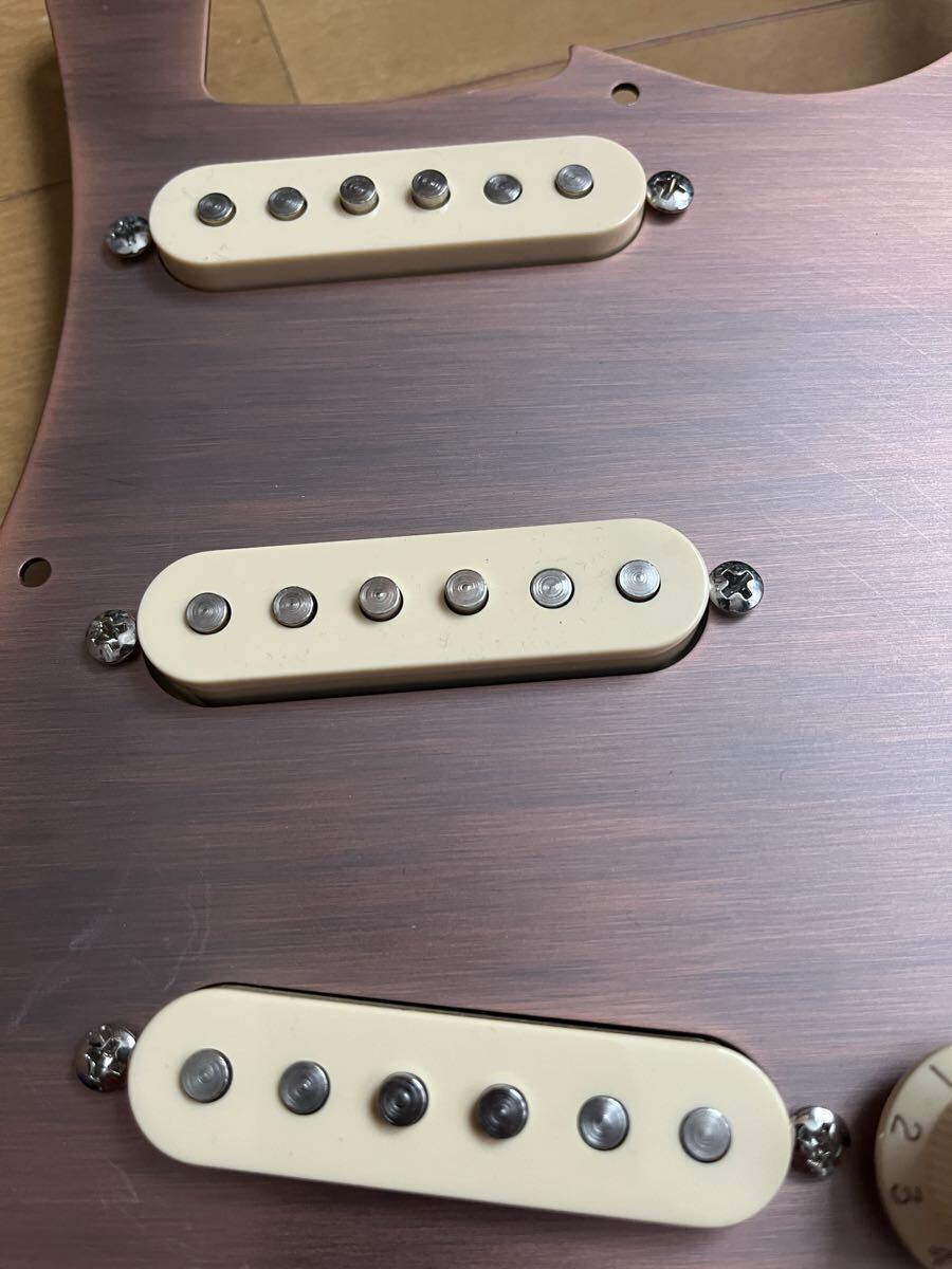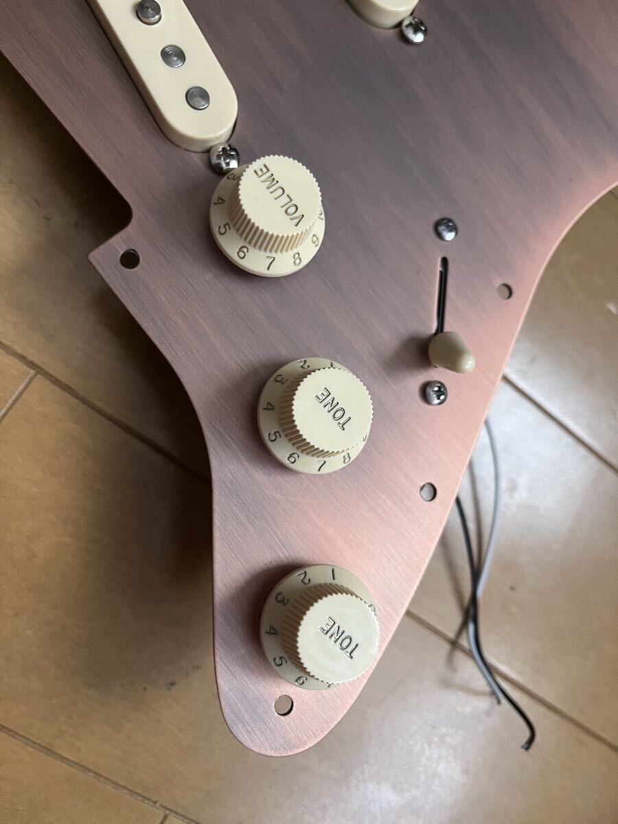 銅メッキのアノタイズドピックガードに新品で購入したピックアップを載せています。ポットは知人から70年代のジャパンビンテージに使用されていたものを譲り受け、セレクターは新品の5wayです。