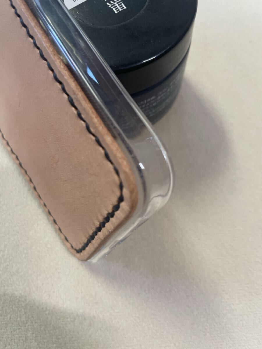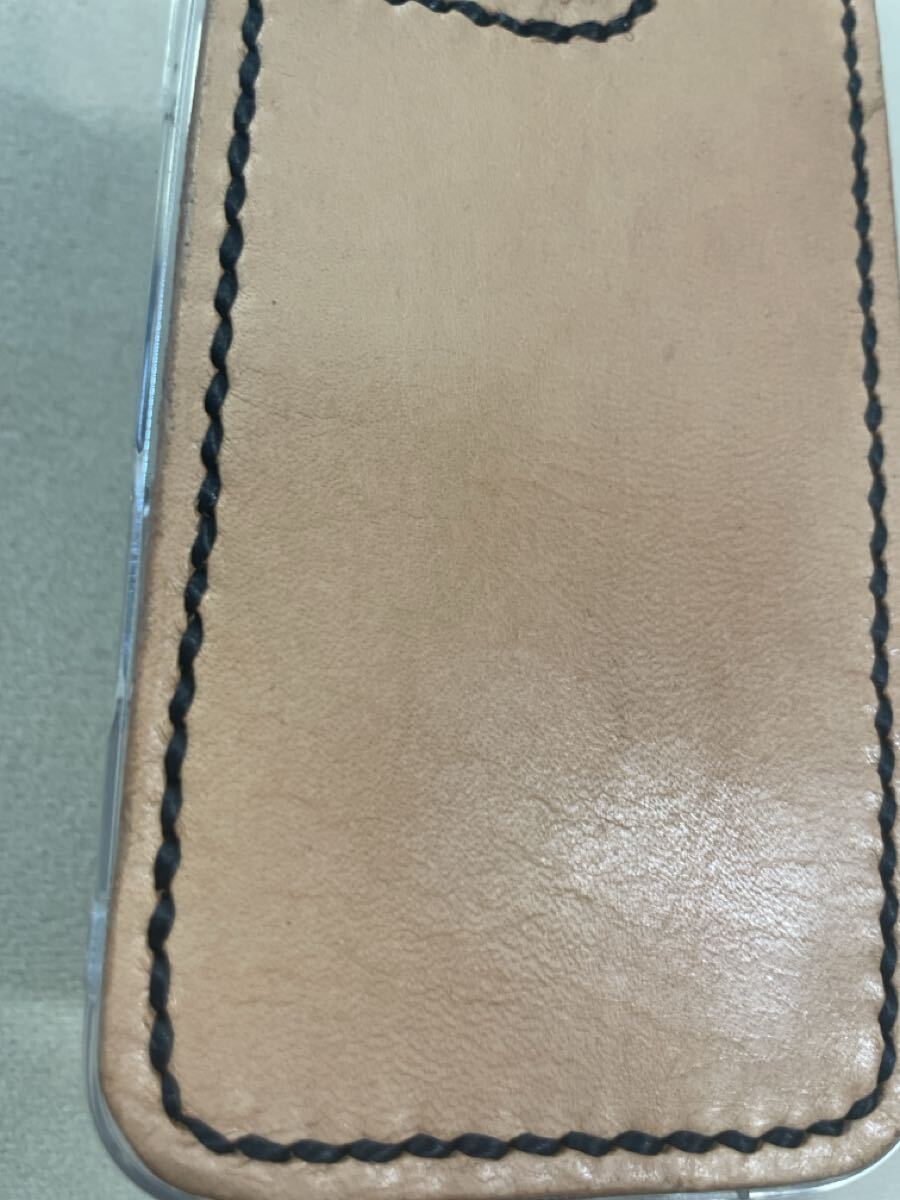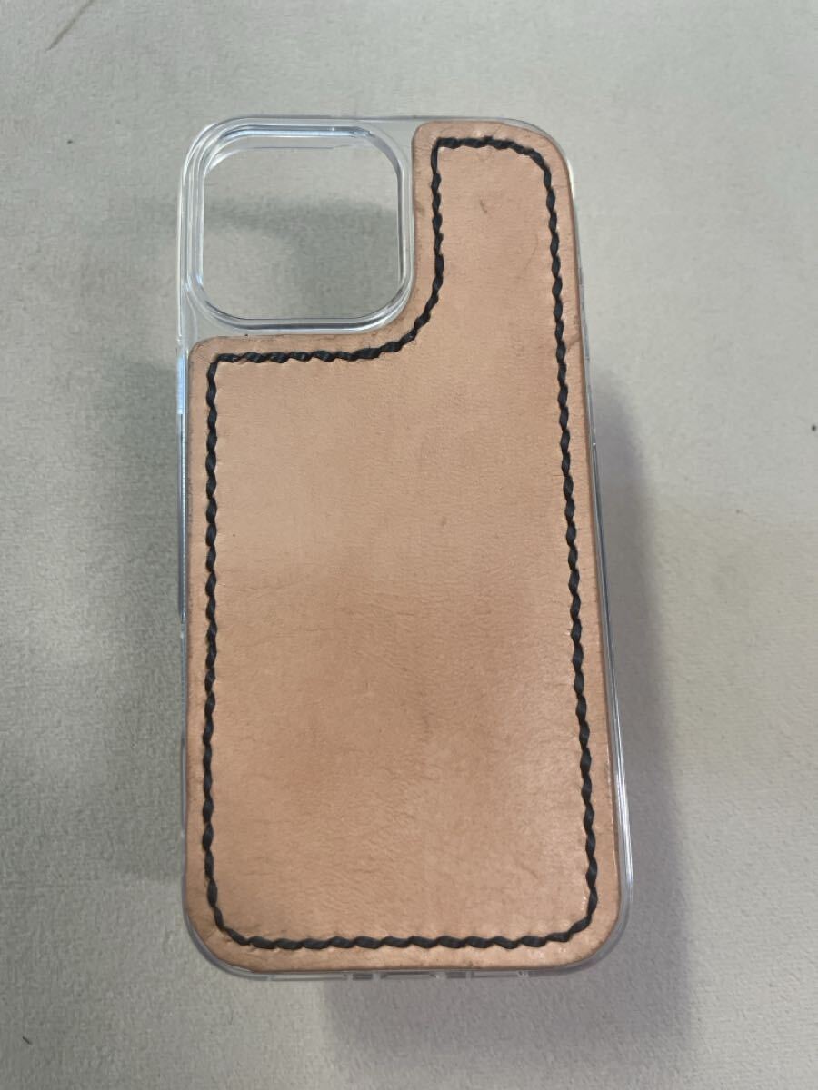 国産タンニンなめし牛革とダイソー製ソフトケースを張り合わせ、黒シニュー糸で手縫いで縫い合わせてます。