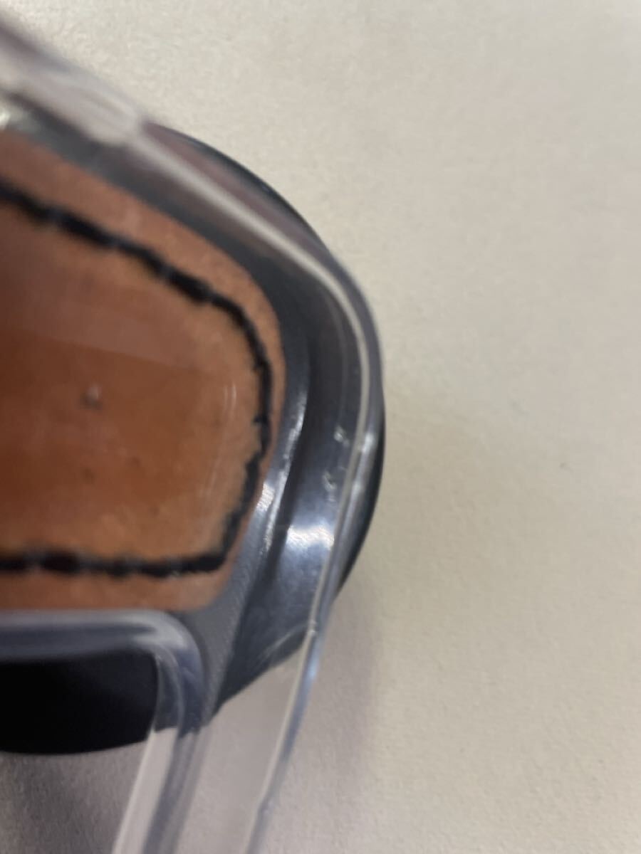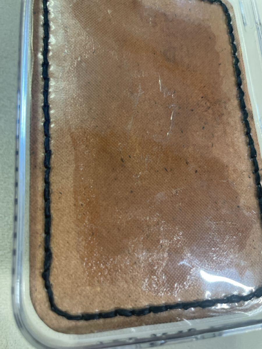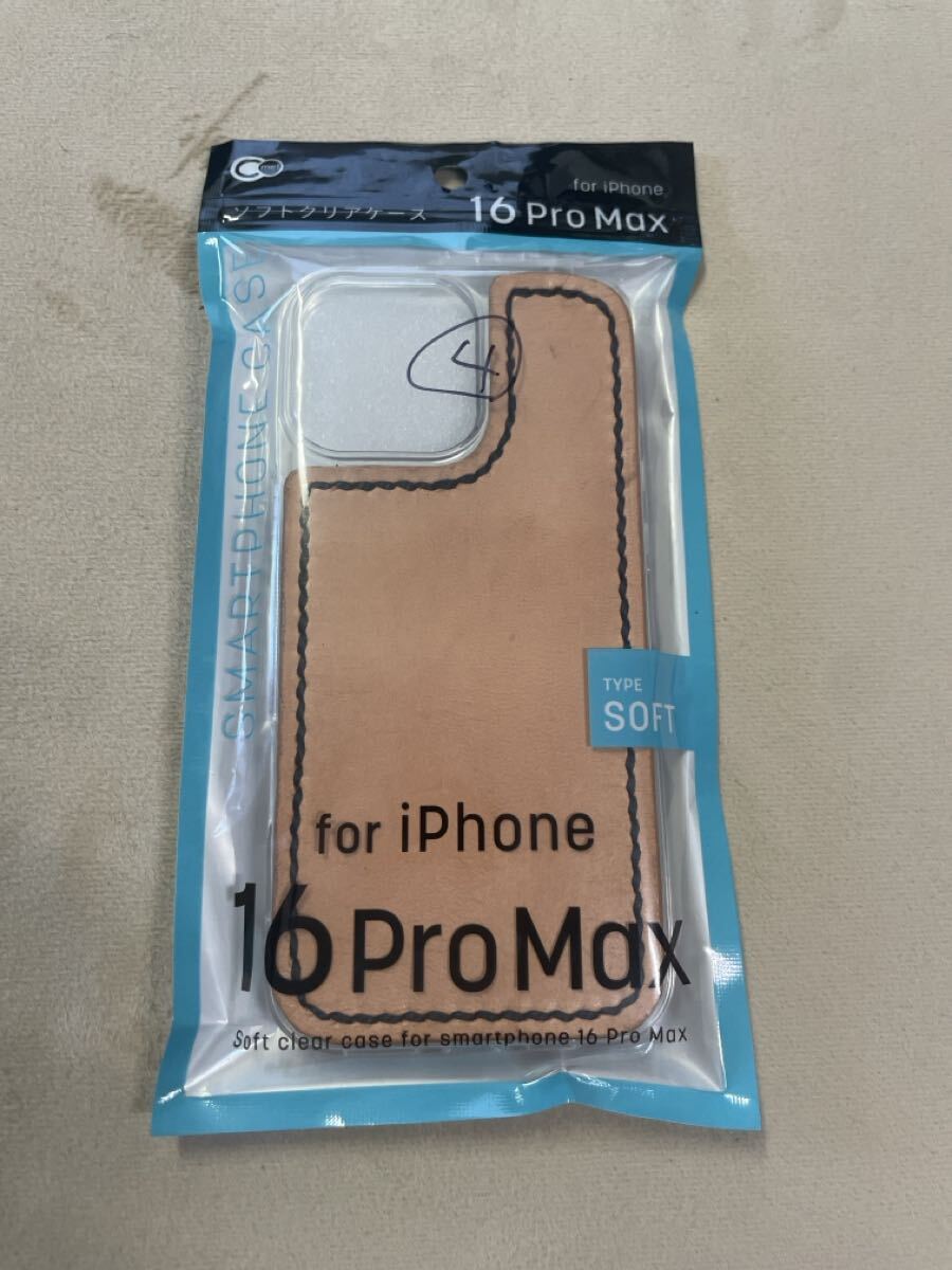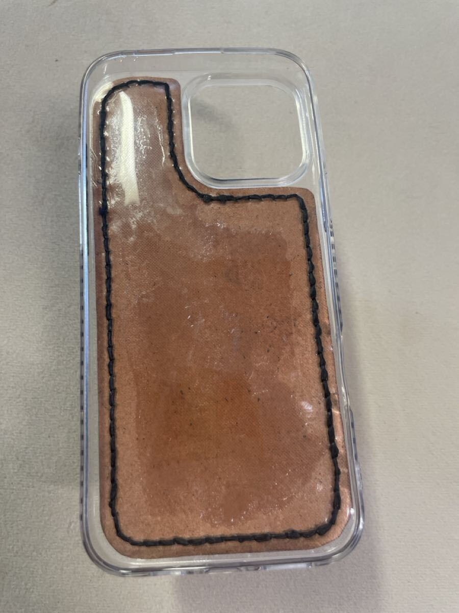国産タンニンなめし牛革とダイソー製ソフトケースを張り合わせ、黒シニュー糸で手縫いで縫い合わせてます。