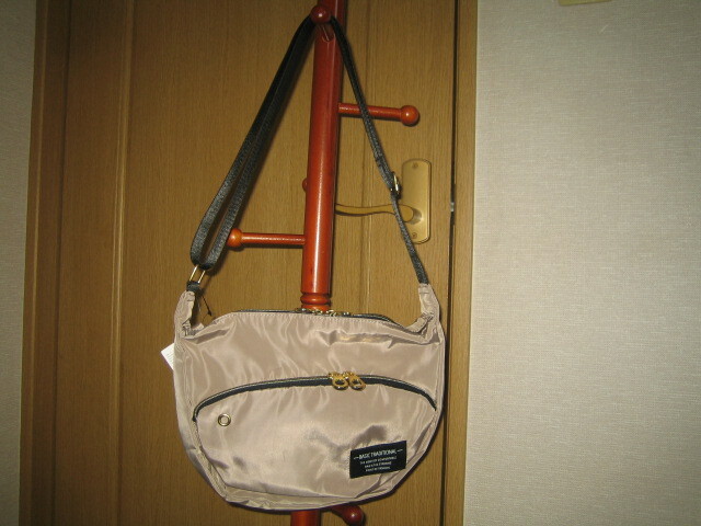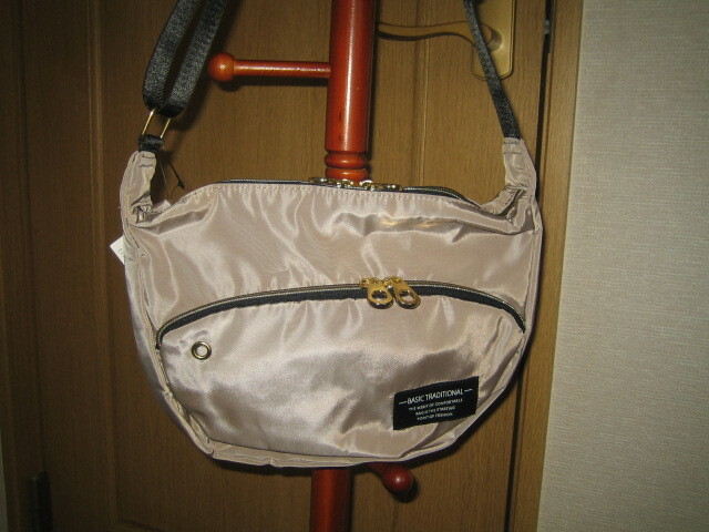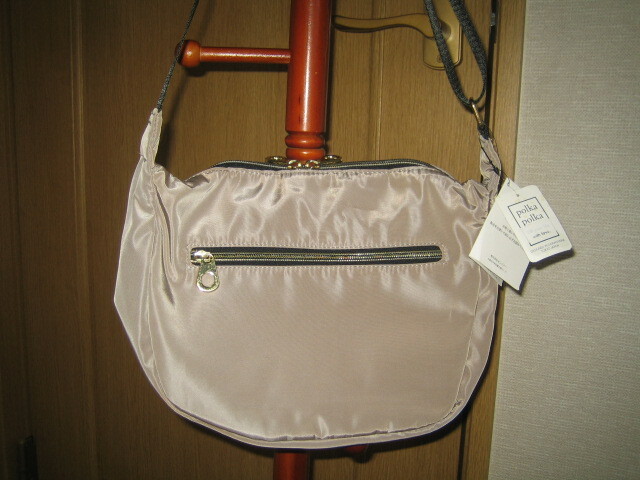 タグ付き軽量半月型ショルダーバッグ ベージュ フロント・背面ポケット有り高密度ポリ