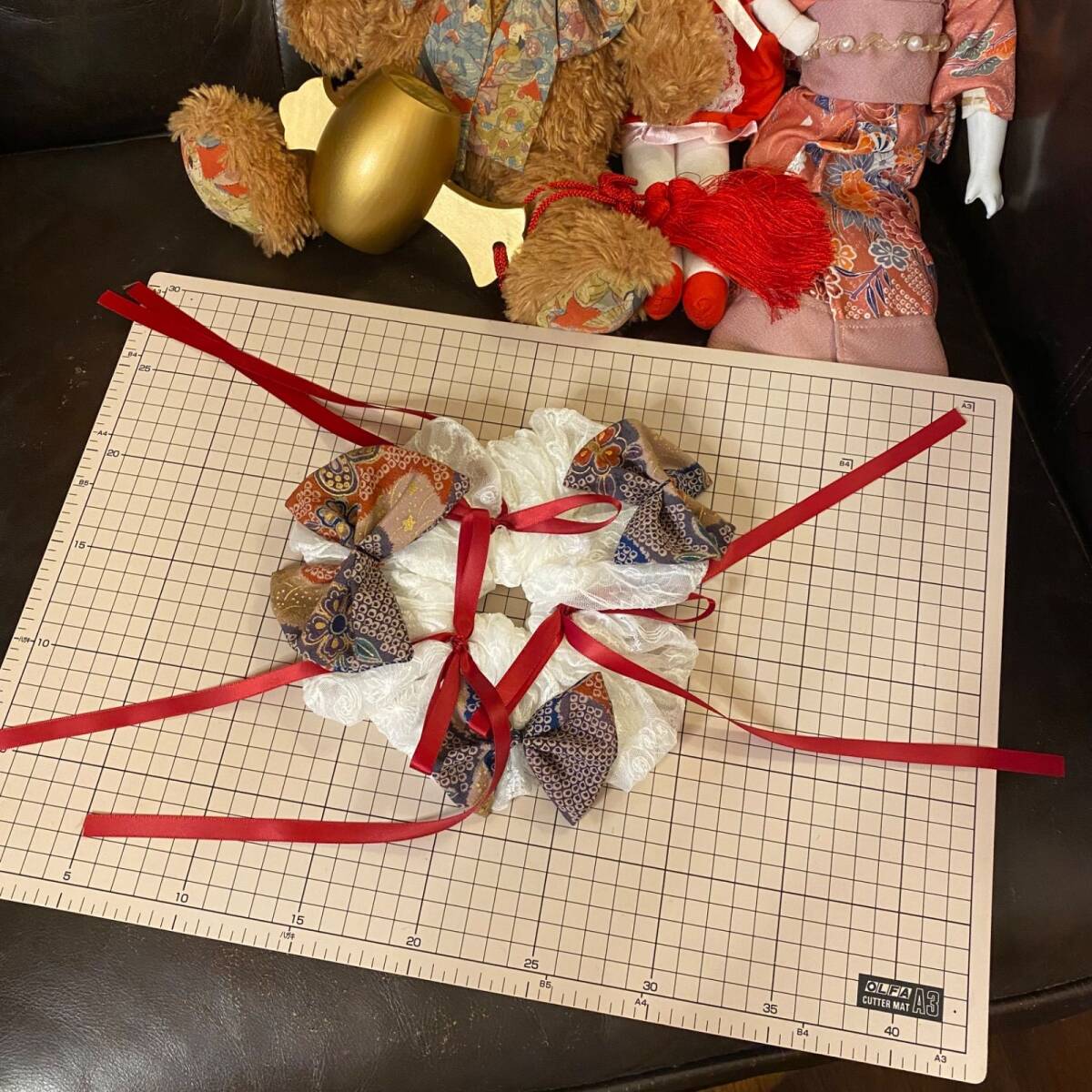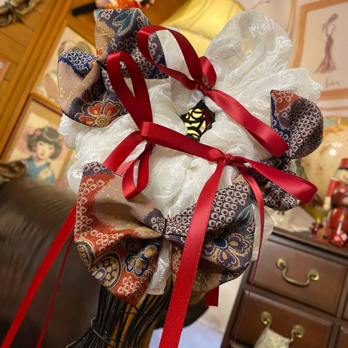 雪のように澄んだ白レースに、柿渋〜煉瓦、藍、紺、金茶を散らした和更紗のミニリボンをぐるり。艶やかな紅のサテンリボンを長めに結んで、動くたびクラシックに揺れます。白×紅×藍のコントラストで、清楚とレトロ感を一度に叶えるシュシュ。