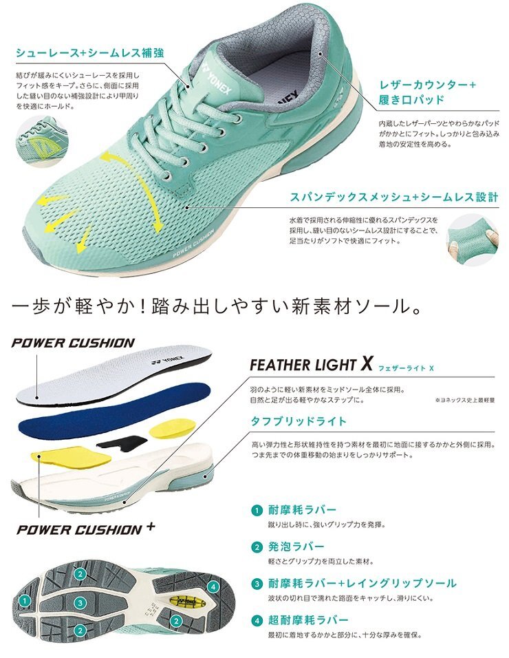 12mの高さから生卵を落としても割れずに6m以上跳ね返す 「パワークッションョンプラス」搭載 。疲れにくい!!ヨネックスのパワークッション、ウォーキングシューズです。 やわらかな足入れ感。しっかりフィットして疲れにくい。 ■ヨネックス史上最軽量素材「フェザーライト エックス」を初搭載 ミッドソール全体には、羽のように軽い新素材「フェザーライト エックス」を弊社ウォーキングシューズに初めて搭載。 従来の軽量素材ハイパーフェザーライトからも軽量化を実現。 ●「スパンデックスメッシュ」+「シームレス設計」で快適フィットし、 「シューレース」+「シームレス補強」で甲部のホールド性がアップ 水着で使用される伸縮性に優れる新素材「スパンデックスメッシュ」を採用し、縫い目のないシームレス設計とすることで、足当たりがソフトで快適にフィットします。 また、結びが緩みにくいシューレースを採用しフィット感をキープ。側面に採用した縫い目のない補強設計により甲周りを快適にホールドします。 ●「タフブリッドライト」と各所に配置したラバーで耐久性と安定性を両立 最初に地面に接するかかと外側には、高い弾力性と形状維持性を持つ素材「タフブリッドライト」を採用することで、つま先までの体重移動の始まりをしっかりサポート。 底面には各所に最適なラバーを配置し、優れた耐久性と安定性を実現。 様々な甲の高さや足幅にも柔軟に適応します。 ●軽やかに踏み出しやすい新素材搭載ソール 軽量性とクッション性を両立したソール設計により、長時間でも疲れにくい快適な歩行をサポートします。 ■レイングリップソール 波状の切れ目が地面を捉え、濡れた路面のグリップ性が向上し、滑りにくくなりました。 |