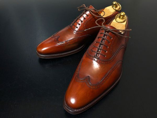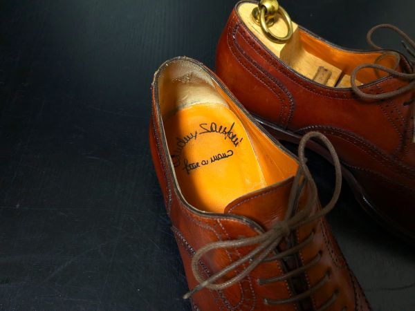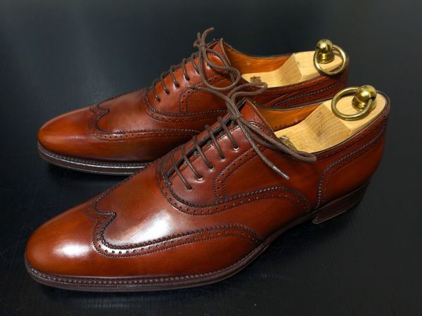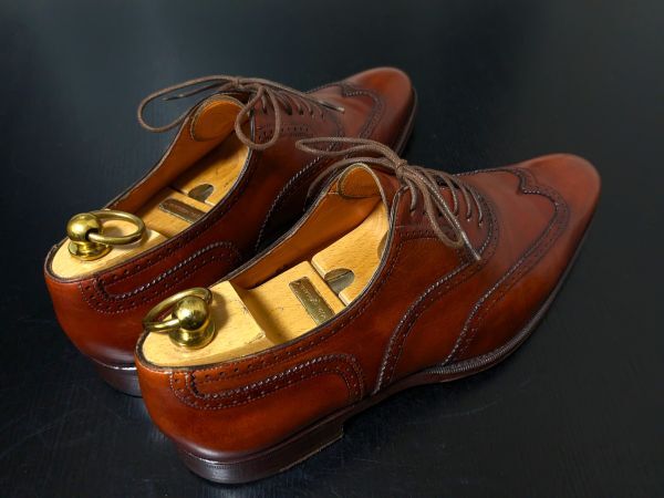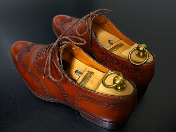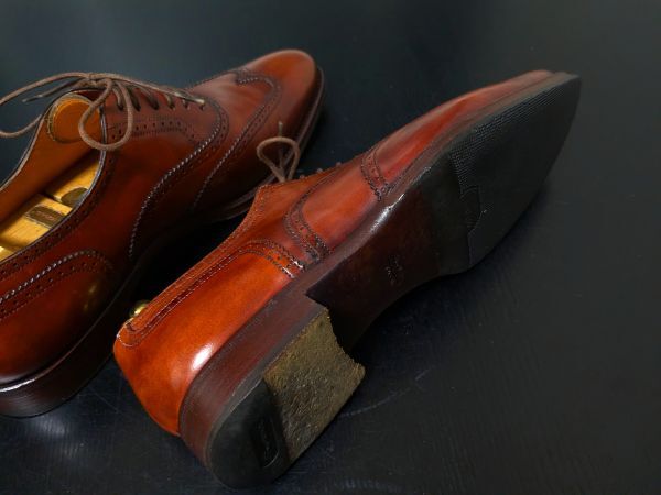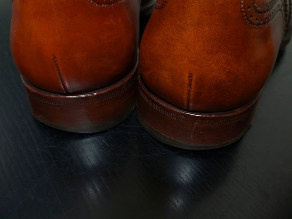 お色は濃茶、ダブルレザーソールでアッパー含めドレスとしてかなりしっかりしたつくりのアイテム。かっちりしたビジネスでも十分活躍するアイテム。細かいシワ感などの使用個は確認できますが、傷、汚れなどはあまりなく全体的に綺麗なアイテムかと思います。現状、大きなメンテナンスは必要なくそのまま当分利用可能。まだまだ活躍するアイテムです。
