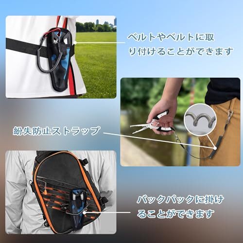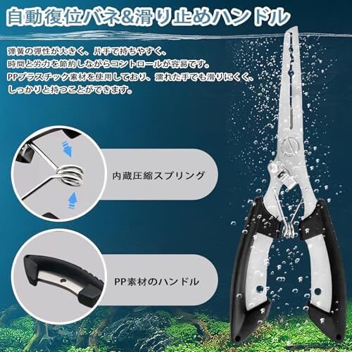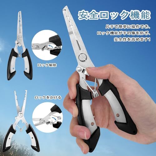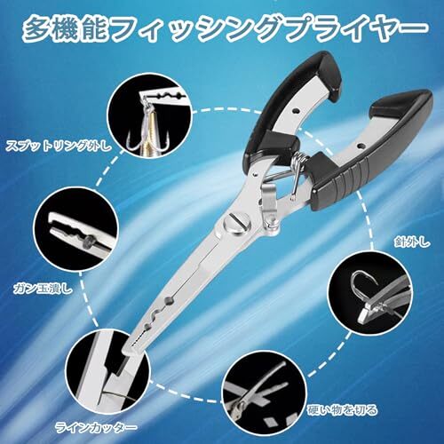 【多機能性】:このプライヤーは多機能で、先端は魚を引き上げたり、フックを外したり、小型スプリットリングを開けたりできます。プライヤー本体では、オモリを挟んだり、オモリを潰したり、PEラインなどの硬い物を切ることもできます。