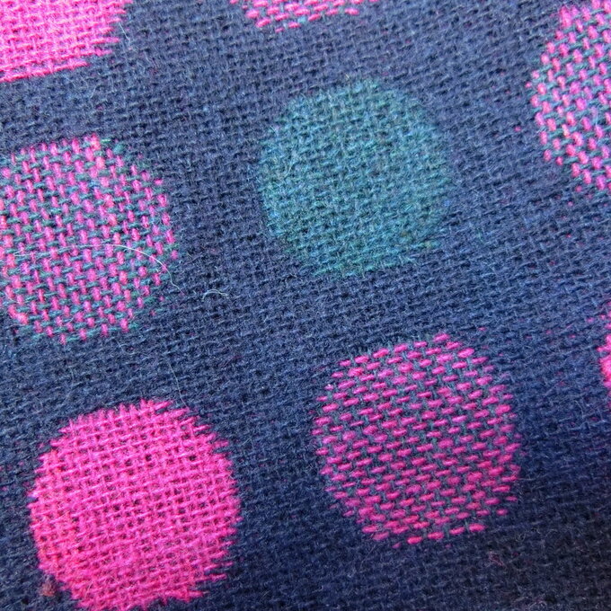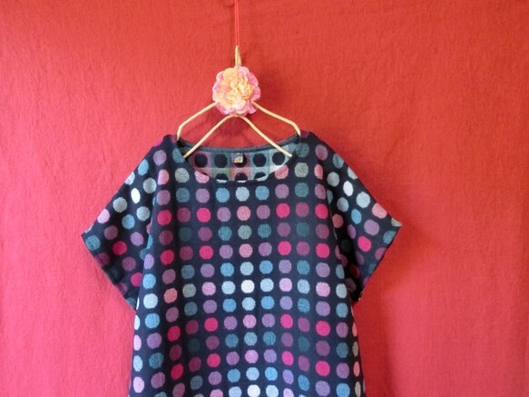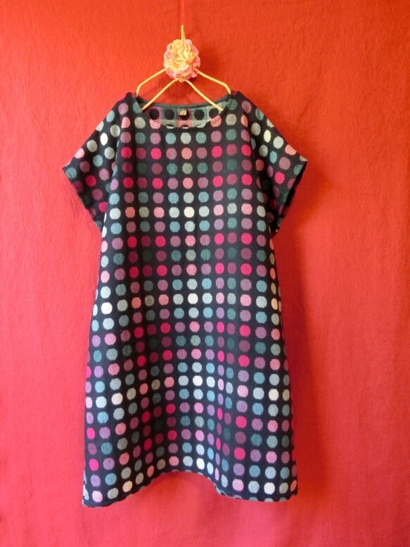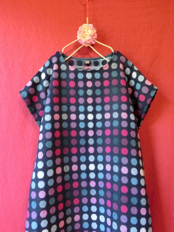 ウール混*カラフル水玉 半袖ワンピース 紺* ハンドメイド *北欧*ナチュラル*728