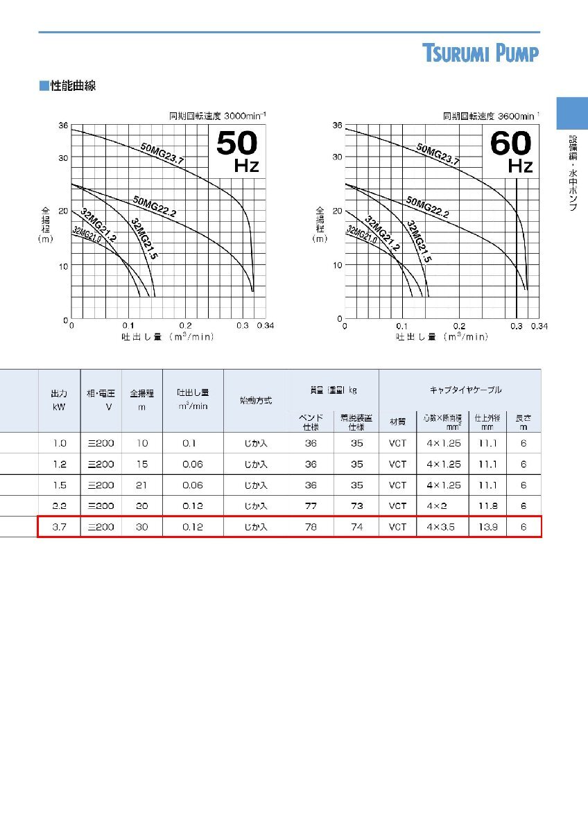 鶴見製作所 ツルミポンプ 50MG23.7 60Hz 西日本用 汚物用 水中グラインダーポンプ MG型 口径50mm 出力3.7kW 水中ポンプ ※こちらの商品は、「代金引換」支払を ご利用いただけません。