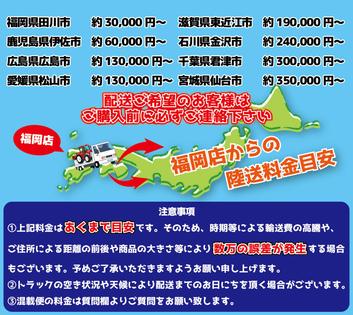 *商品受け渡し方法* 小型商品 佐川急便 【配送不可 エンジン等が搭載の商品は基本的に配送不可】 西濃運輸 中型商品 【配送不可 トラクター、コンバイン、田植機等、または一辺が2000mm を超える商品】 陸送業者 大型商品 【配送不可 北海道、離島、その他配送不可の場合あり。】 北海道や離島に関してはフェリー配送等がありますのでお問い合わせください。 送料が0円となっておりますが送料は落札商品配送に必要になりますのでご注意下さい。 直接お引き取りも大歓迎ですのでお気軽にお申し出ください。 お近くのお客さまですと自社配送も対応していますのでお気軽にご質問下さい。 (陸送の到着時期に関しましては陸送業者さまの配送都合により指定できないこと、到着までに長く時間がかかることがございますのでその点ご理解していただいたお客さまのみ依頼させていただきます。) 配送が重なる等の事がありますので配送が遅れる場合があります。 当社が手配させていただける陸送業者はございますが、陸送業者の配送スケジュールの関係で到着時期が遅くなる事もあります。お急ぎの場合は落札者様でお手配下さい。その他の予定との都合で遅れる可能性もあります。 入札後、落札後のキャンセルはいかなる理由であれお受けすることはできません。 出品商品につきましては全てノークレーム、ノーリターンですのでしっかりとお考えの上、ご入札よろしくお願いいたします。 【万が一キャンセルをされる場合には、落札金額もしくは入札金額の20%をキャンセル代としてお支払いいただきます。】 |