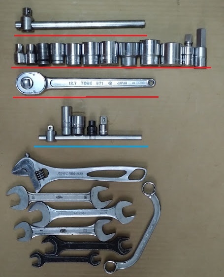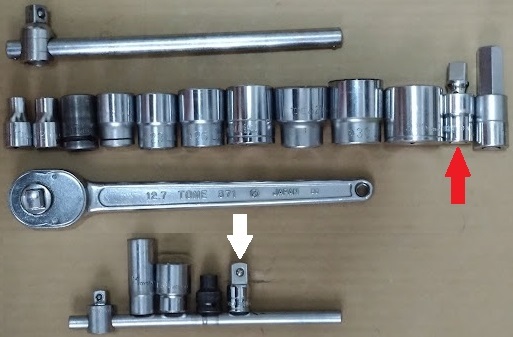 5枚目画像内の赤矢印はユニーバサルソケットで白矢印が9.5から12.7への変換ソケットです。