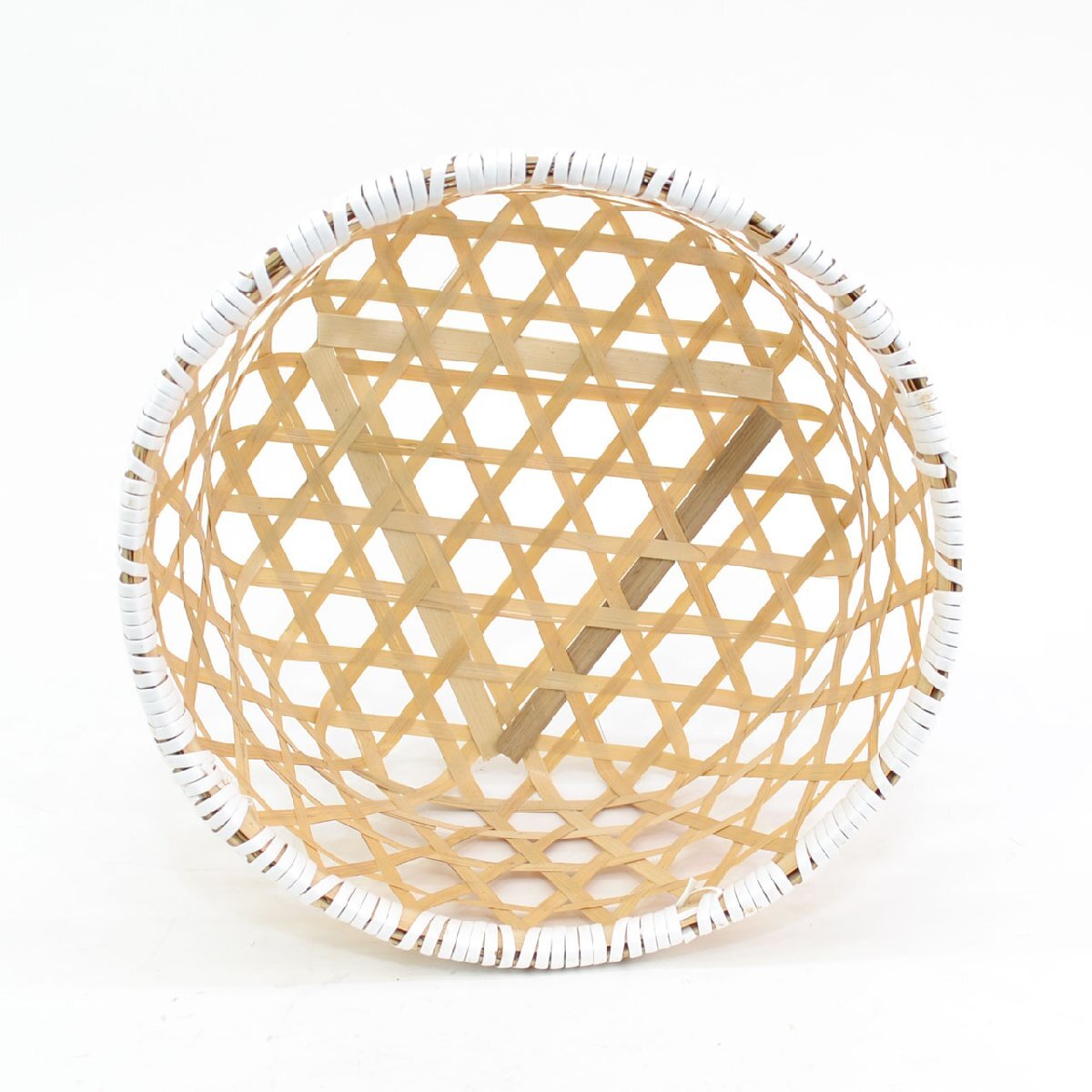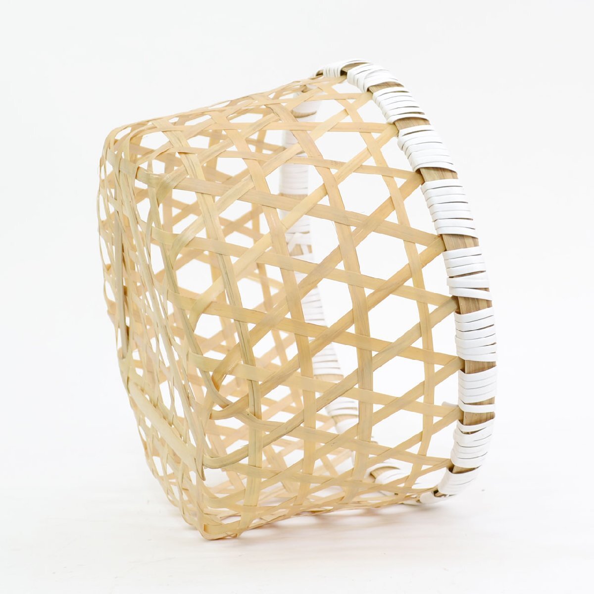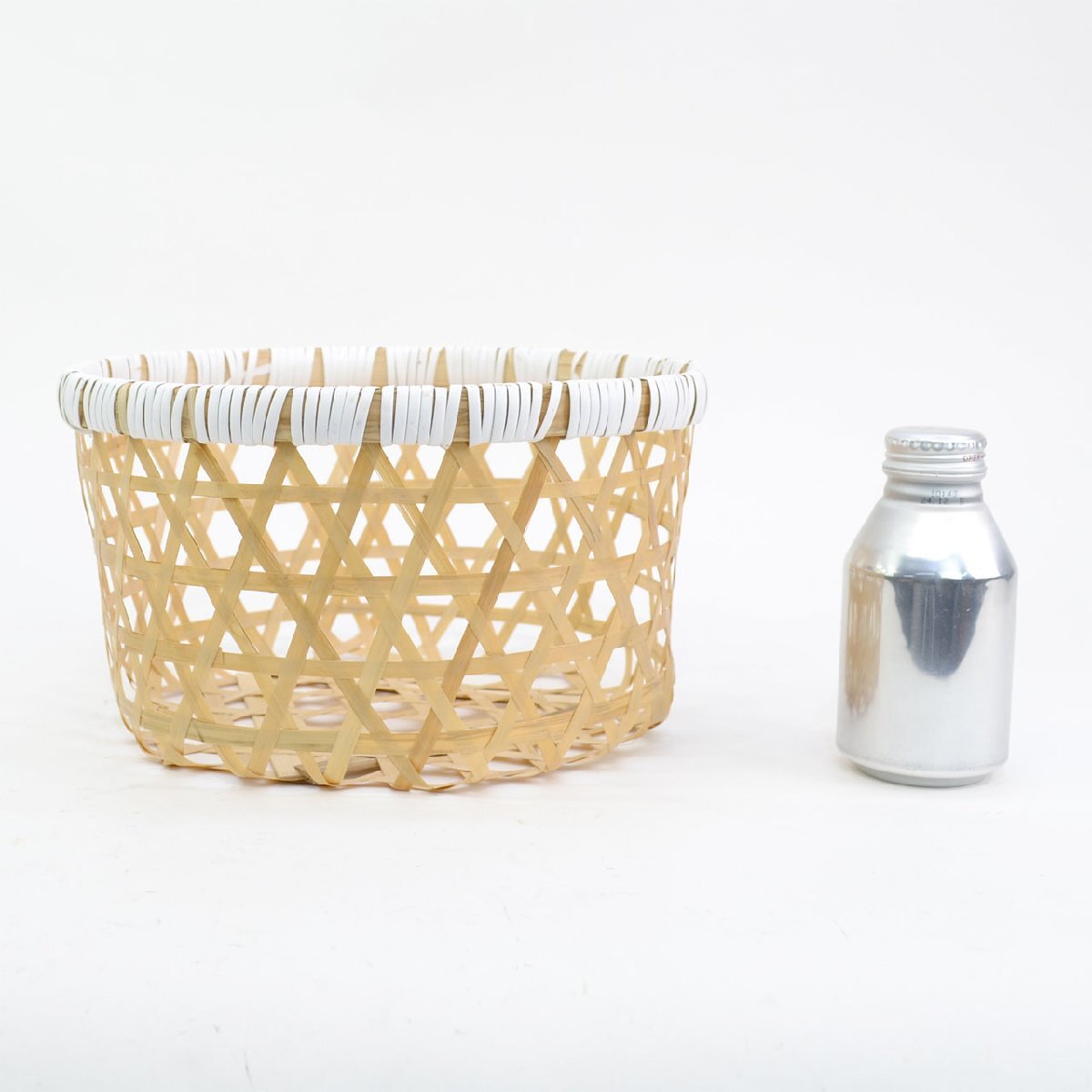 竹製六つ目編みの丸籠。PPバンドで縁取りしています。