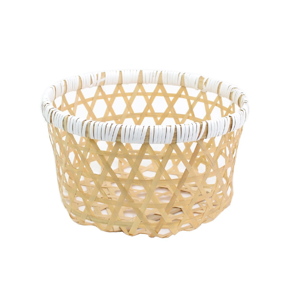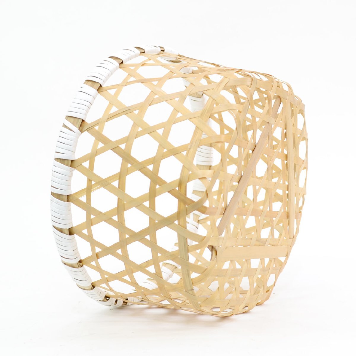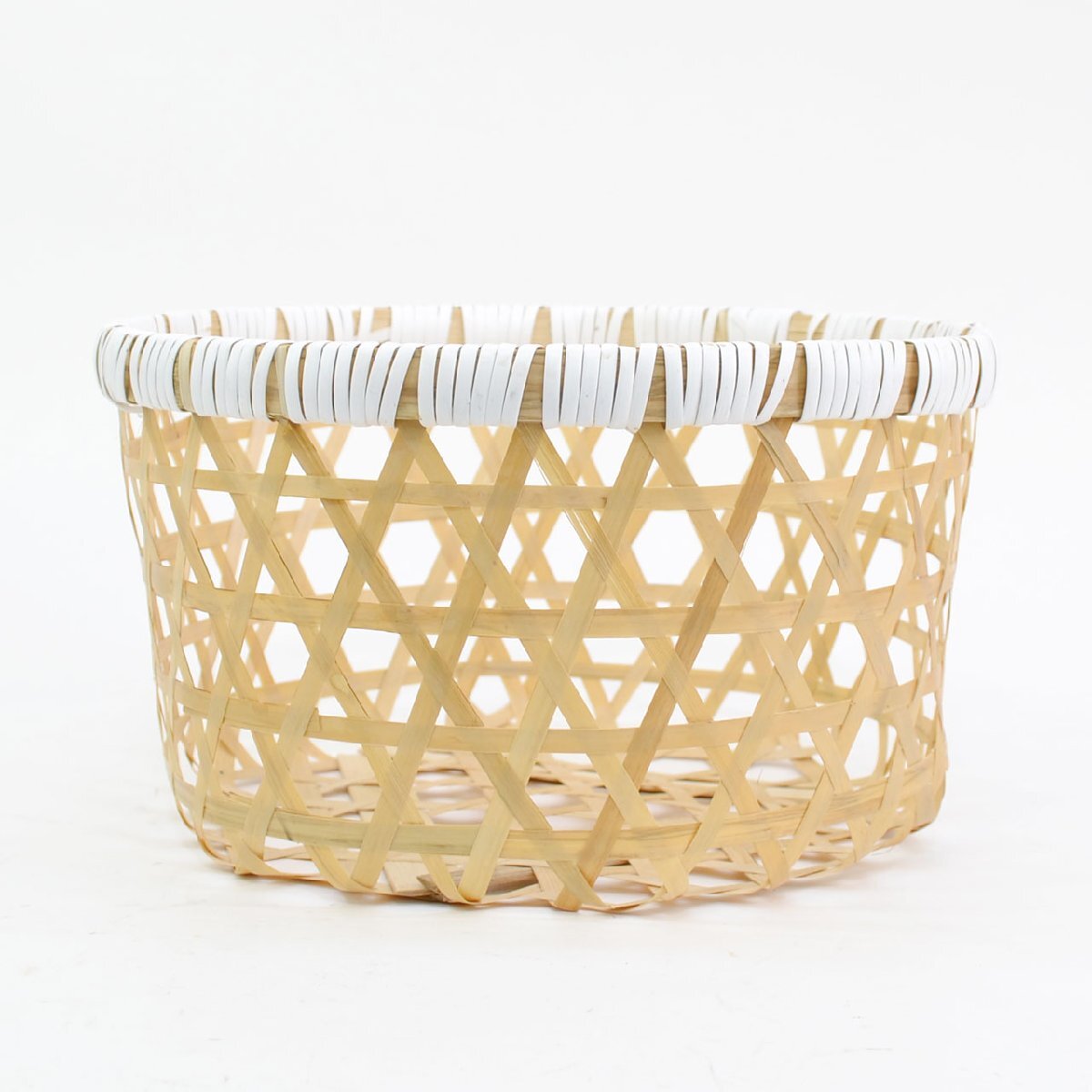 竹製六つ目編みの丸籠。PPバンドで縁取りしています。
