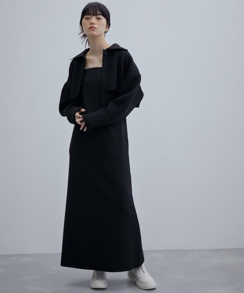 ワンピース:ハイゲージで高密度に編んだ、フルニードル編地のニット。身体のラインを拾いにくい張り感が特徴で、ストレッチ性のある動きやすさも魅力。