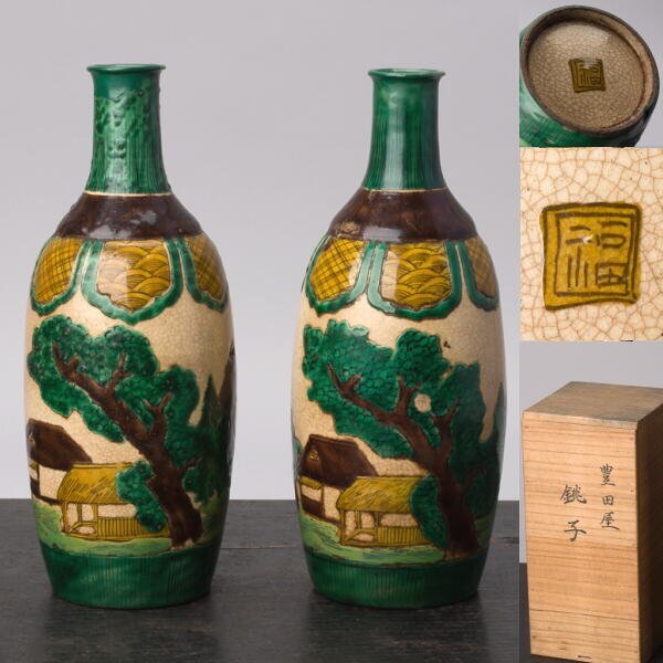 再興九谷徳利2本一対。 桐箱に「豊田屋」とありますが、豊田屋という九谷の窯は私は存じ 上げません。 これは豊田家が開いた窯、「吉田屋」と書きたかったのでは?とも思えます。 サイズは、2本とも高さ約21cm、幅約8.5cmです。 2本とも口に共直しあります。 1本に3か所釉剥げあります。 箱の桟がどちらも欠損して無くなっています。 状態・詳細は、画像でご確認お願いいたします。 |
