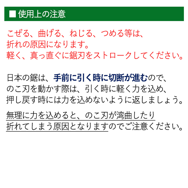 軽く、真っ直ぐに鋸刃をストロークしてご使用ください。