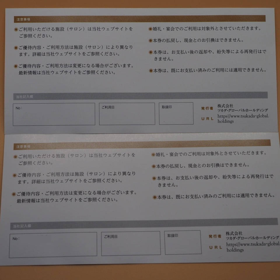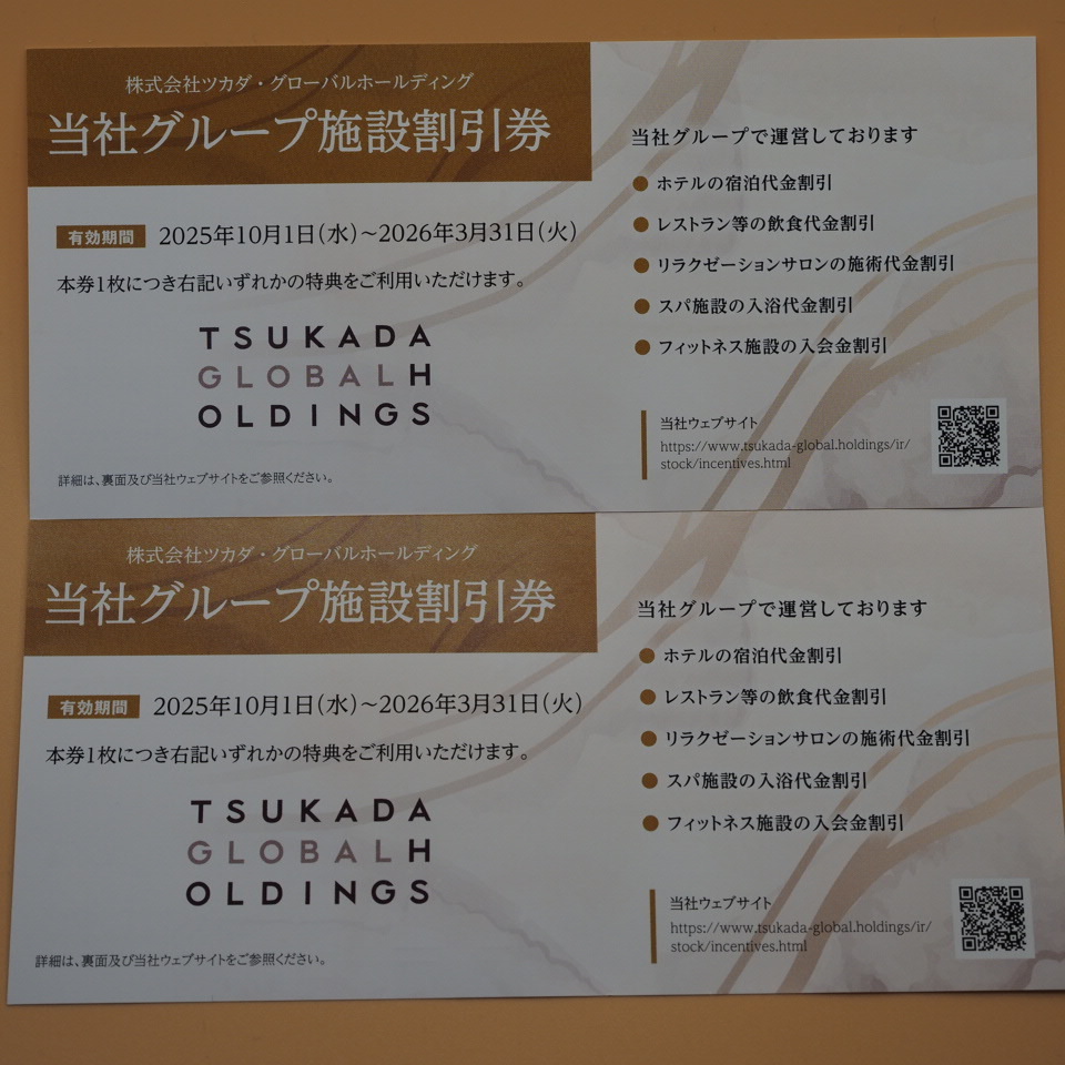 ■ツカダ 株主優待券 2枚 ・有効期限:2025年10月1日~2026年3月31日 ・(株)ツカダ・グローバルホールディングの ホテル宿泊代金割引 レストランなどの飲食代金割引 リラクゼーションサロンの施術代金割引 スパ施設の入浴代金割引 フィットネス施設の入会金割引 ★ゆうパケットポストmini出品者負担 |