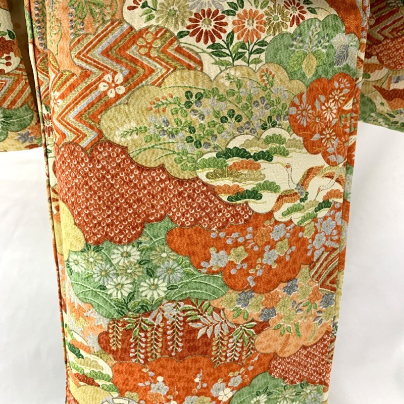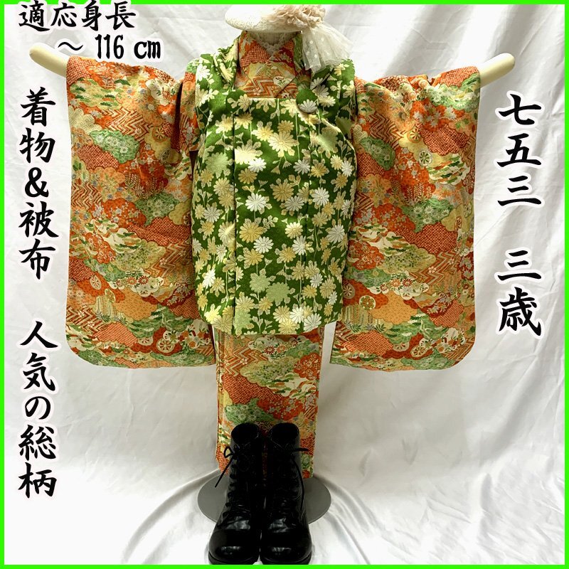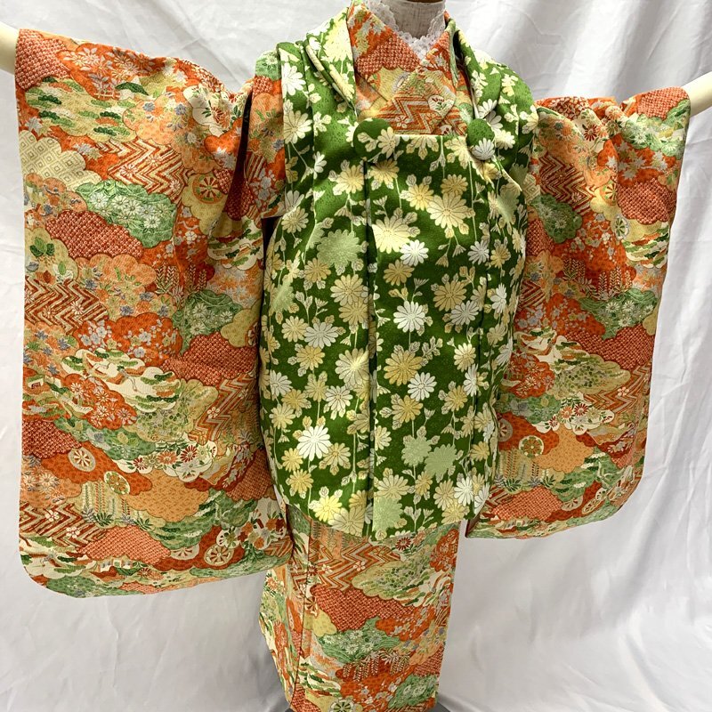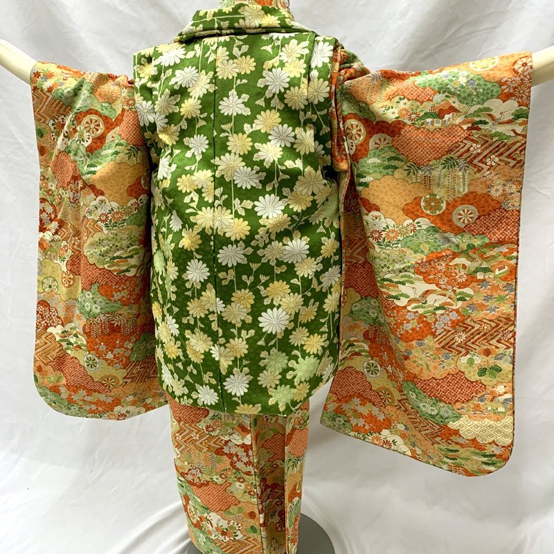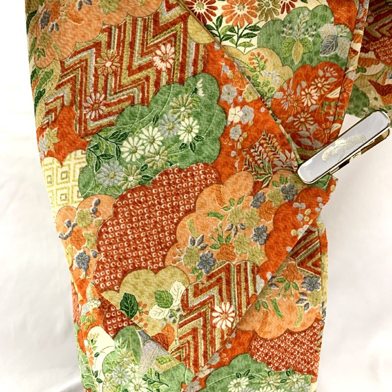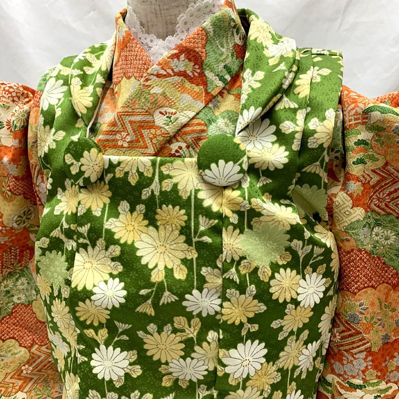 □七五三 三歳 セミアンティーク 女児 着物&被布 総柄 オレンジ□状態良好 (No.hd) *こちらの商品は一つ身着物&ハンドメイド被布のセットです。その他の小物はセットに含まれません。 人気のセミアンティーク着物に、ハンドメイド被布を合わせました。オレンジなどの地に、様々な柄の雲取り文様が素敵な七五三3歳のお着物セットです。 (着物)身幅やや大きめサイズ。写真の様に、胴裏や袖の内側にシミがございますが着用時見えません。 (長襦袢)こちらには長襦袢が付属いたしません。代わりにお子様の負担が少なく便利な「子ども用楽々衿」をお勧めします。#ag楽々衿 (被布)着なくなった中古品の化繊の着物をリメイクしたハンドメイド品です。中綿を入れておりません。ハンドメイド品ですので、完璧を求める方はご遠慮ください。 【表地素材】(着物)正絹、(被布)化繊 【色】オレンジ *モニターによって色味は実際と異なる場合がございます。 【サイズ】(着物) 裄:47.5cm、肩上げ幅:3.5cm、袖幅:28.5cm、袖丈:55.5cm、丈(肩から):92cm、腰上げ幅:9.5cm、前幅:20.5cm、後幅:26cm (被布) 幅:48cm、丈(肩から):33cm *素人採寸のため、多少の誤差はご容赦ください。 七五三後は、お正月やお節句などにもいいですよ。お求め安い価格での出品ですので、いかがでしょうか?アンティーク着物で古い物ですので、それなりのシミや汚れ、ほつれなどダメージ等あるかと思います。新品同様の綺麗さをご希望の方、少しのシミやアク、ほつれなどアンティークに御理解頂けない方のご購入はお控えいただきますよう、お願いします。 |