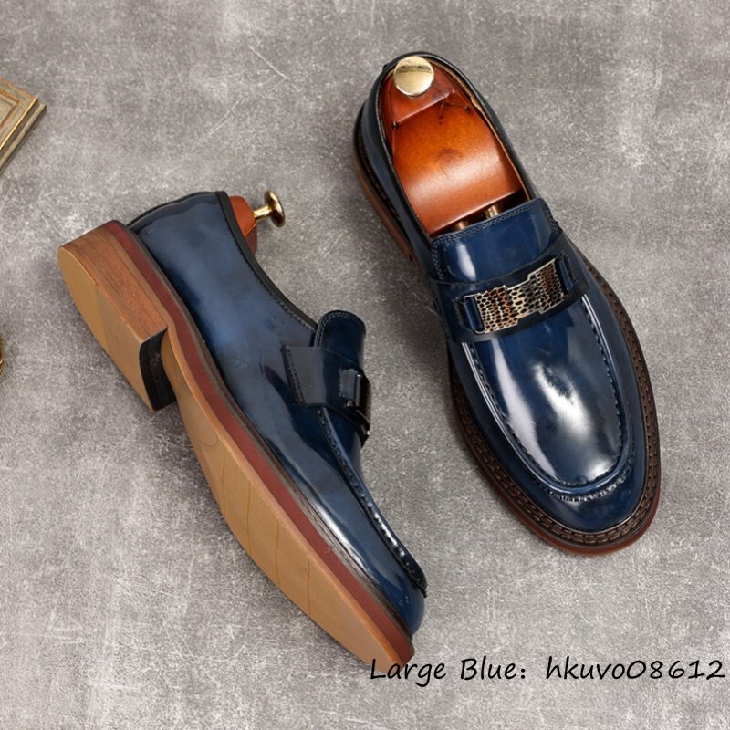 定価12万超◆最高級 本牛革 メンズ ビジネスシューズ 本革 レザーシューズ ローファー 職人手作り スリッポン 結婚式 通勤 ブルー 24.5cm