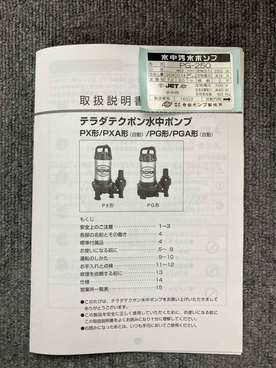 【新品未使用】 寺田ポンプ 排水ポンプ 非自動 100V 60Hz PG-250