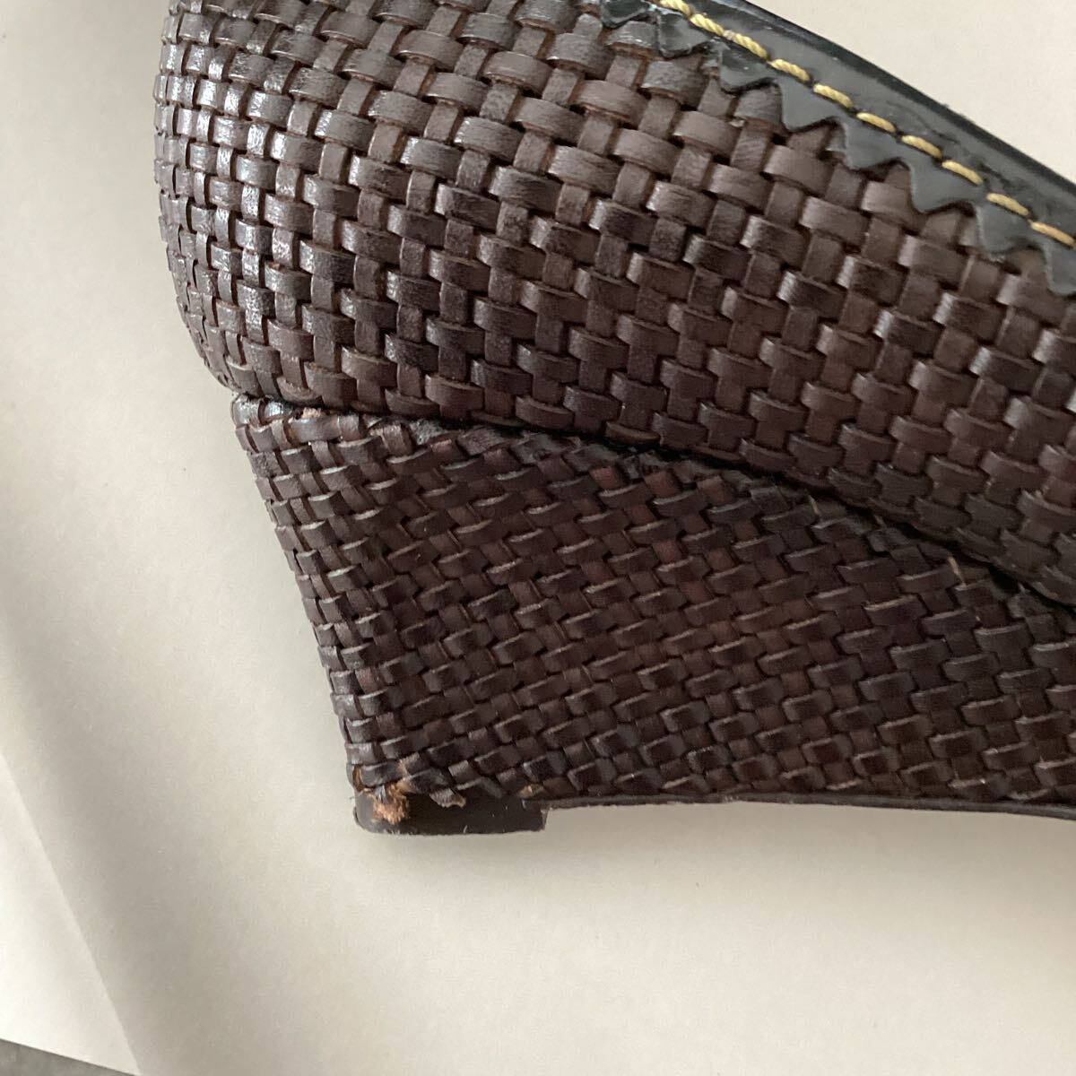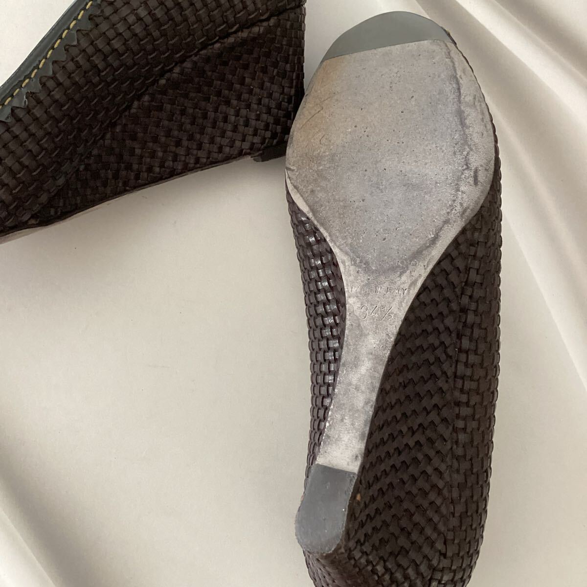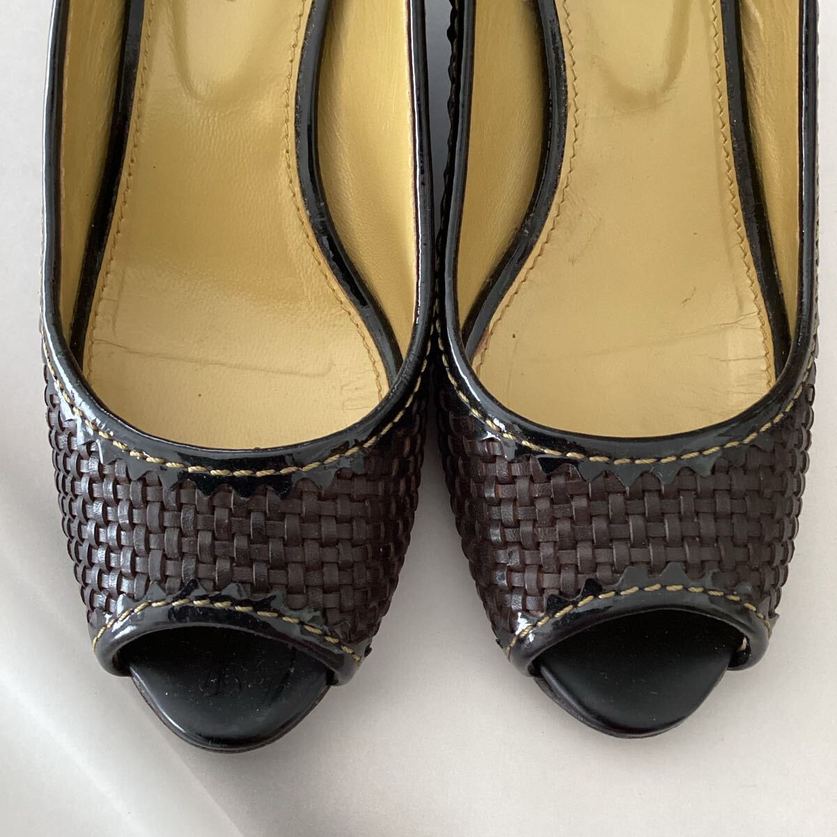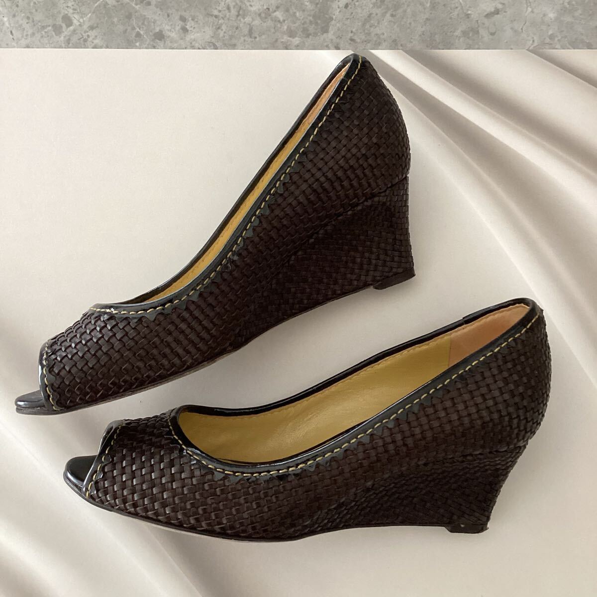 ダークブラウンの編み込みデザインのオープントゥウェッジヒールパンプス。