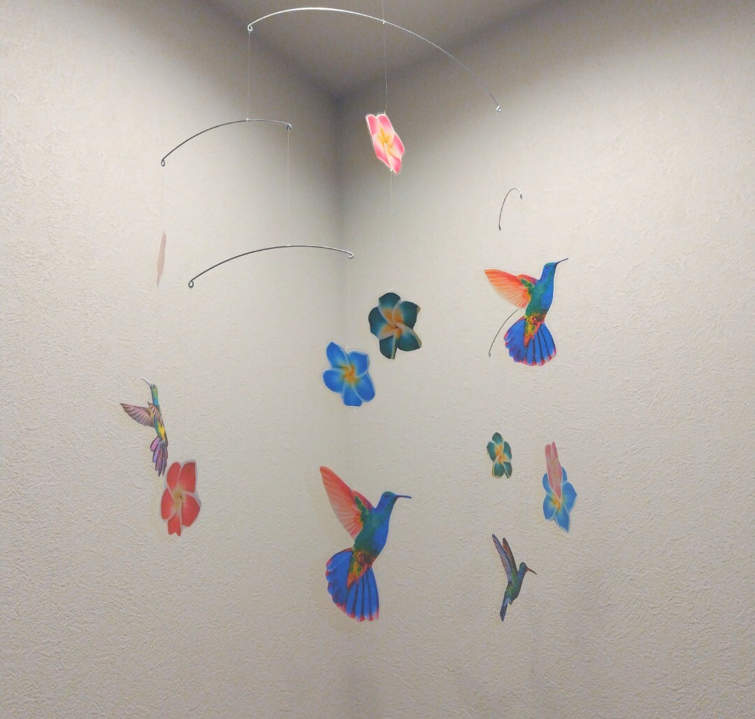 モビールとは動く彫刻。鳥を糸や針金でつるし、それらがバランスを保ちながら、わずかな風で微妙に動くようにしたものです(*^^*)