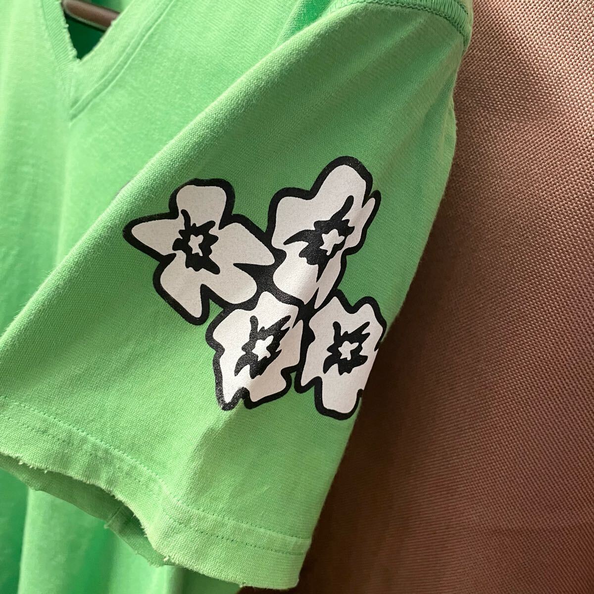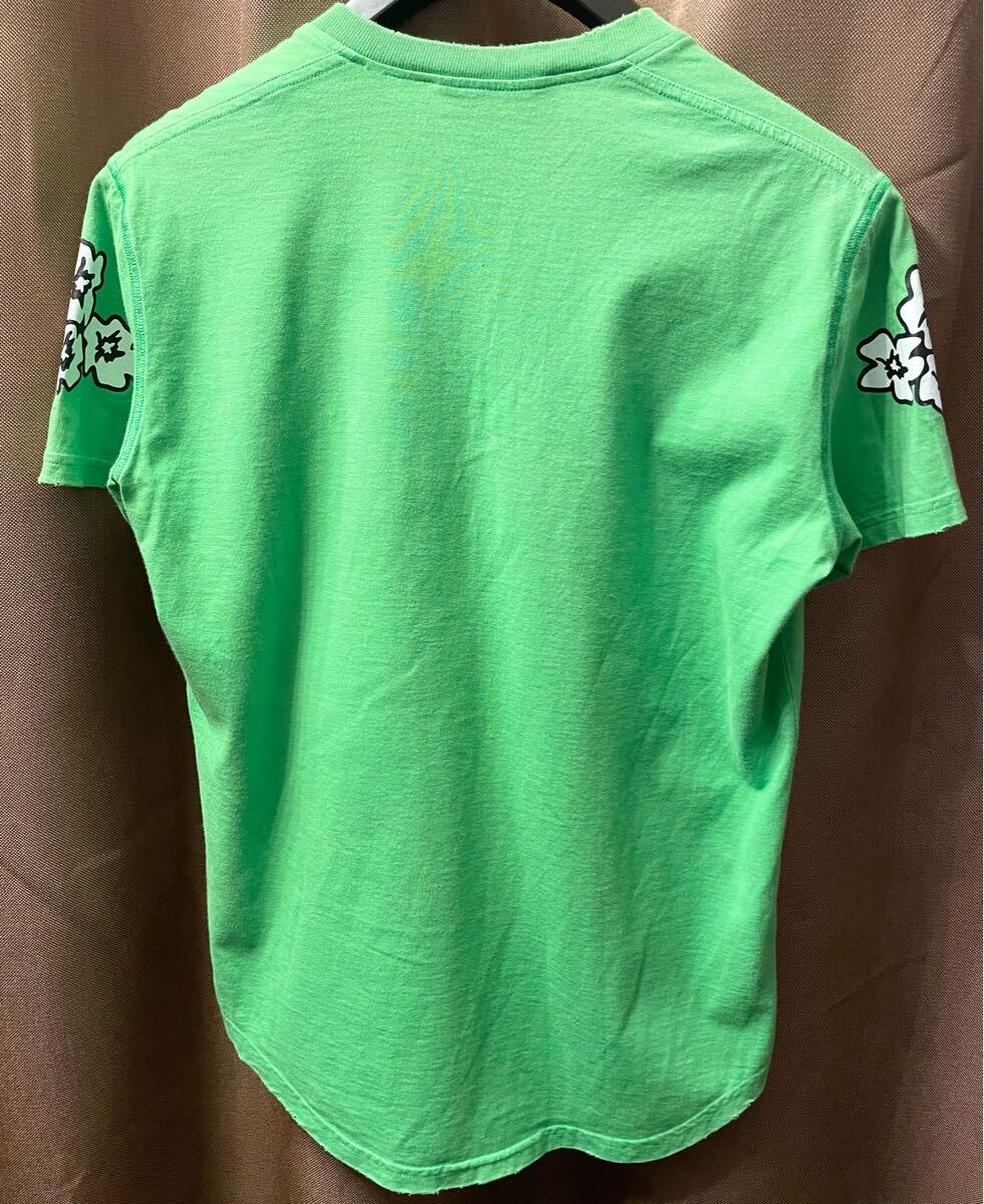 南国の女性や花がプリントされたリゾート感溢れるデザインに、ブランドの特徴で襟や袖がダメージ加工となったおすすめの一品です。