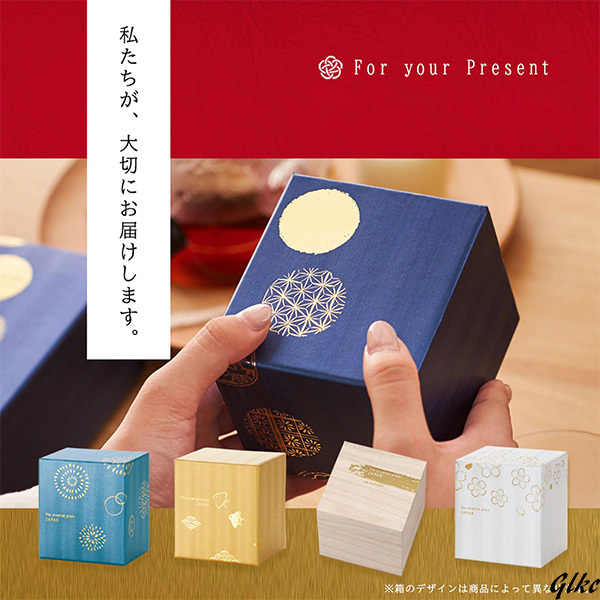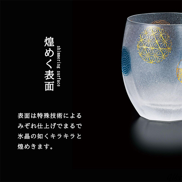 グラスと同じイメージを映した、金の箔押し入り貼り箱が高級感を演出し、ギフトとしての完成度を一段と引き上げます。