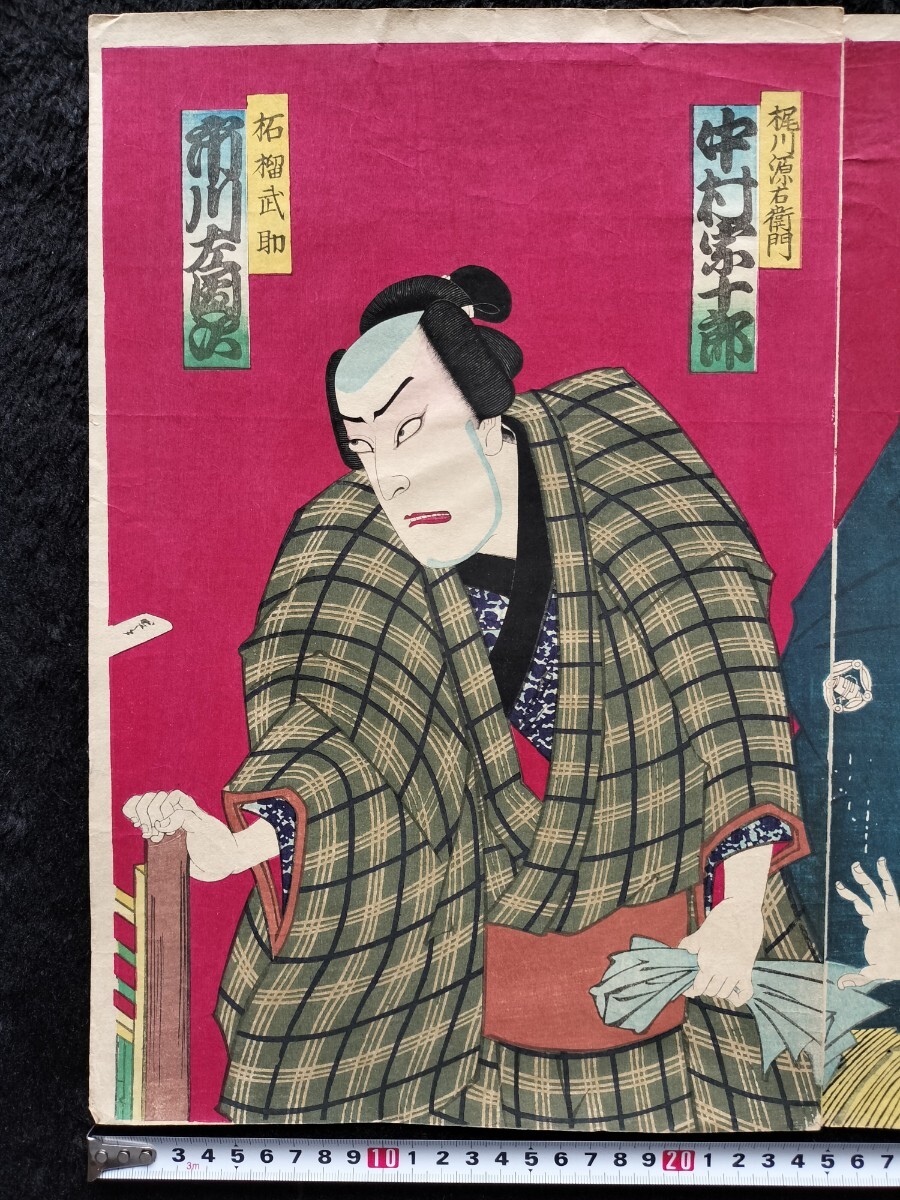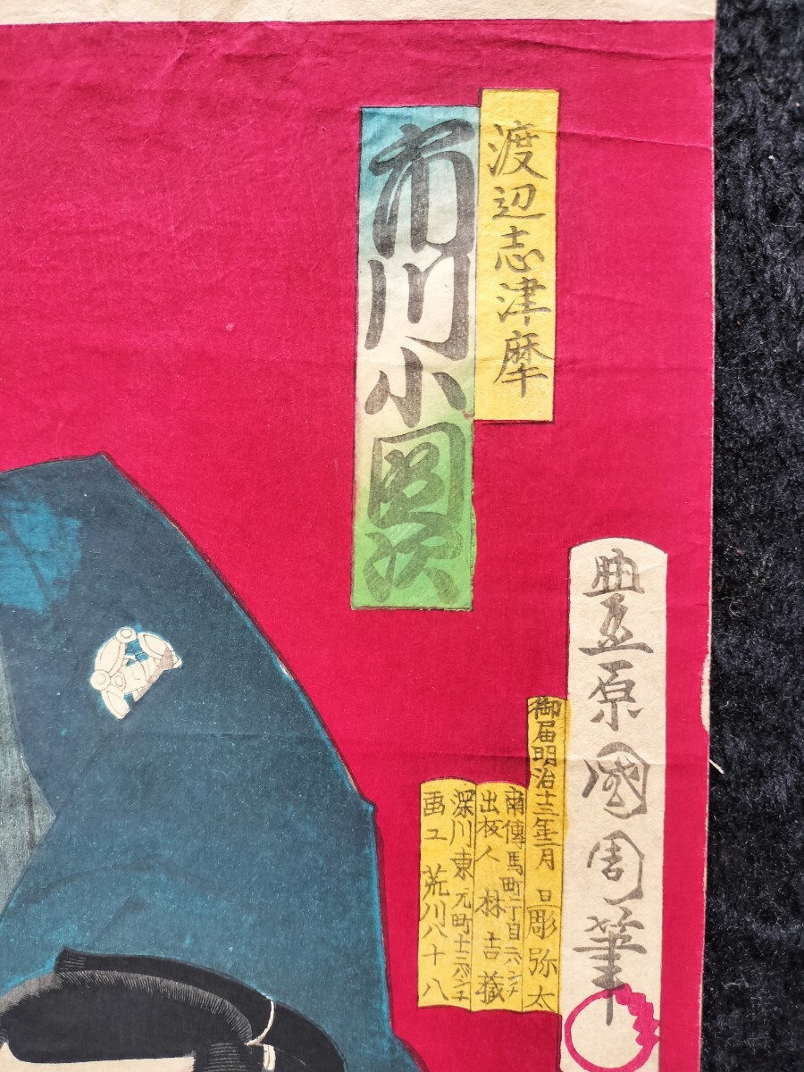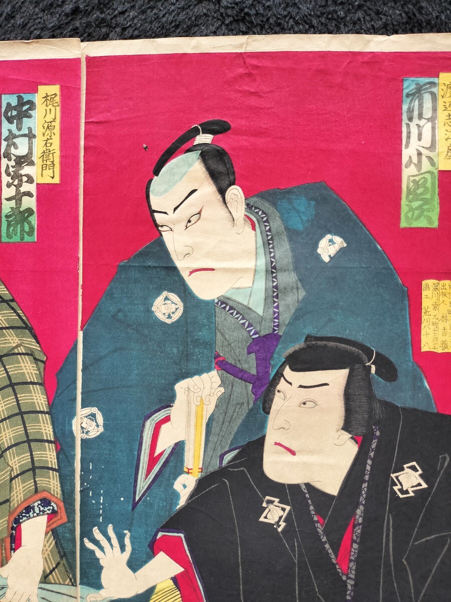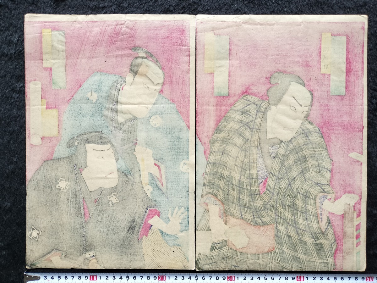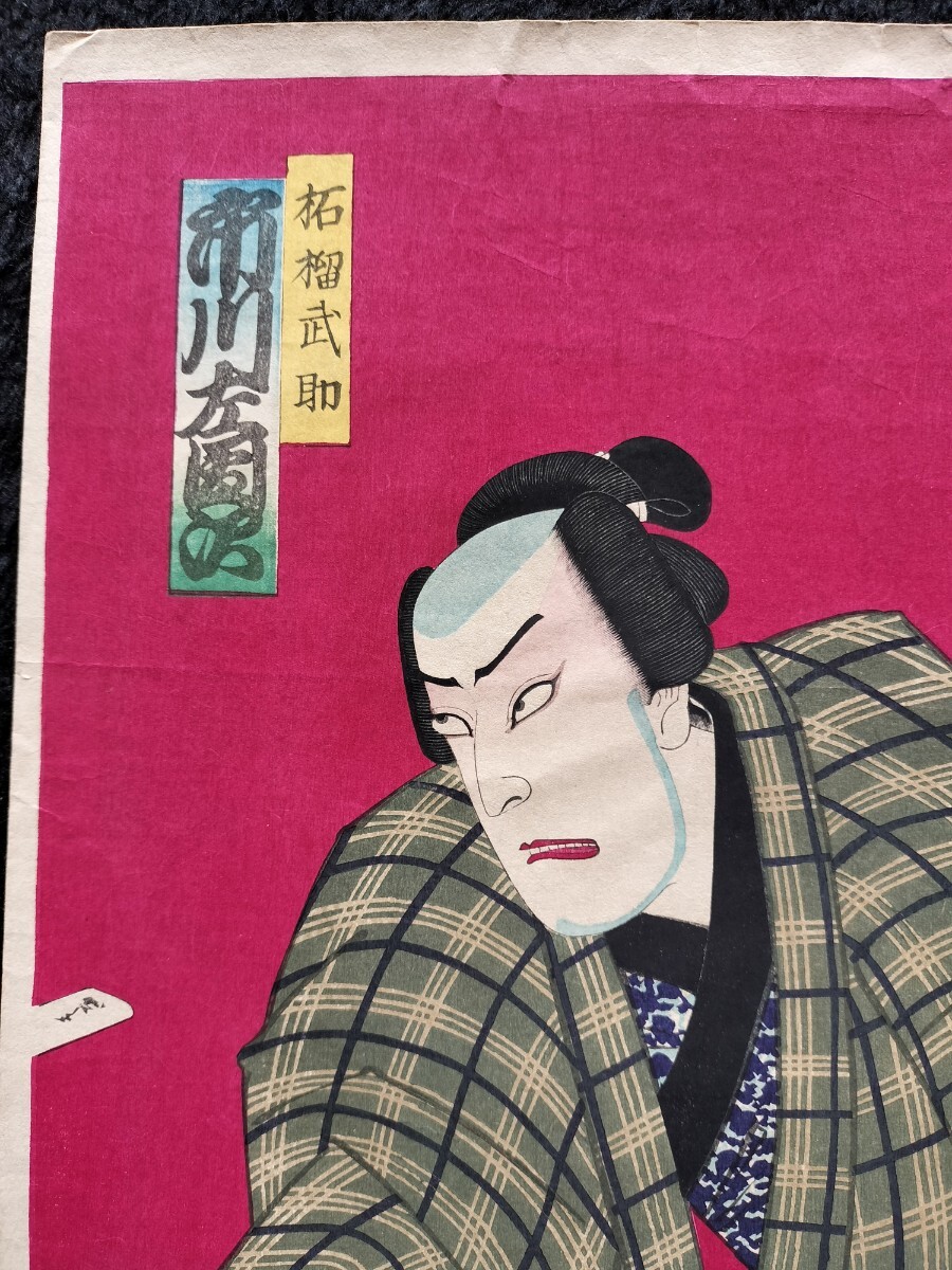 【真作】本物浮世絵木版画 豊原国周「市川小團次」明治期 役者絵 錦絵 大判 二枚続 保存良い 裏打ち