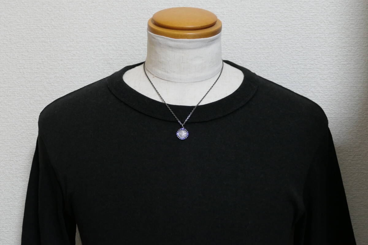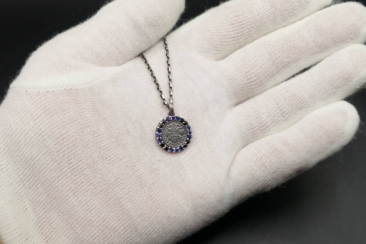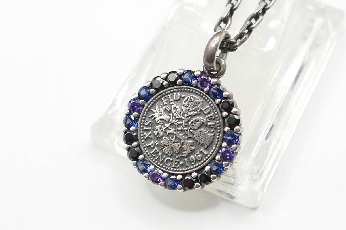『幸せのコイン』といわれるシックスペンスコインシリーズのペンダントで、3色の石を使用した美しいアクセサリーです。