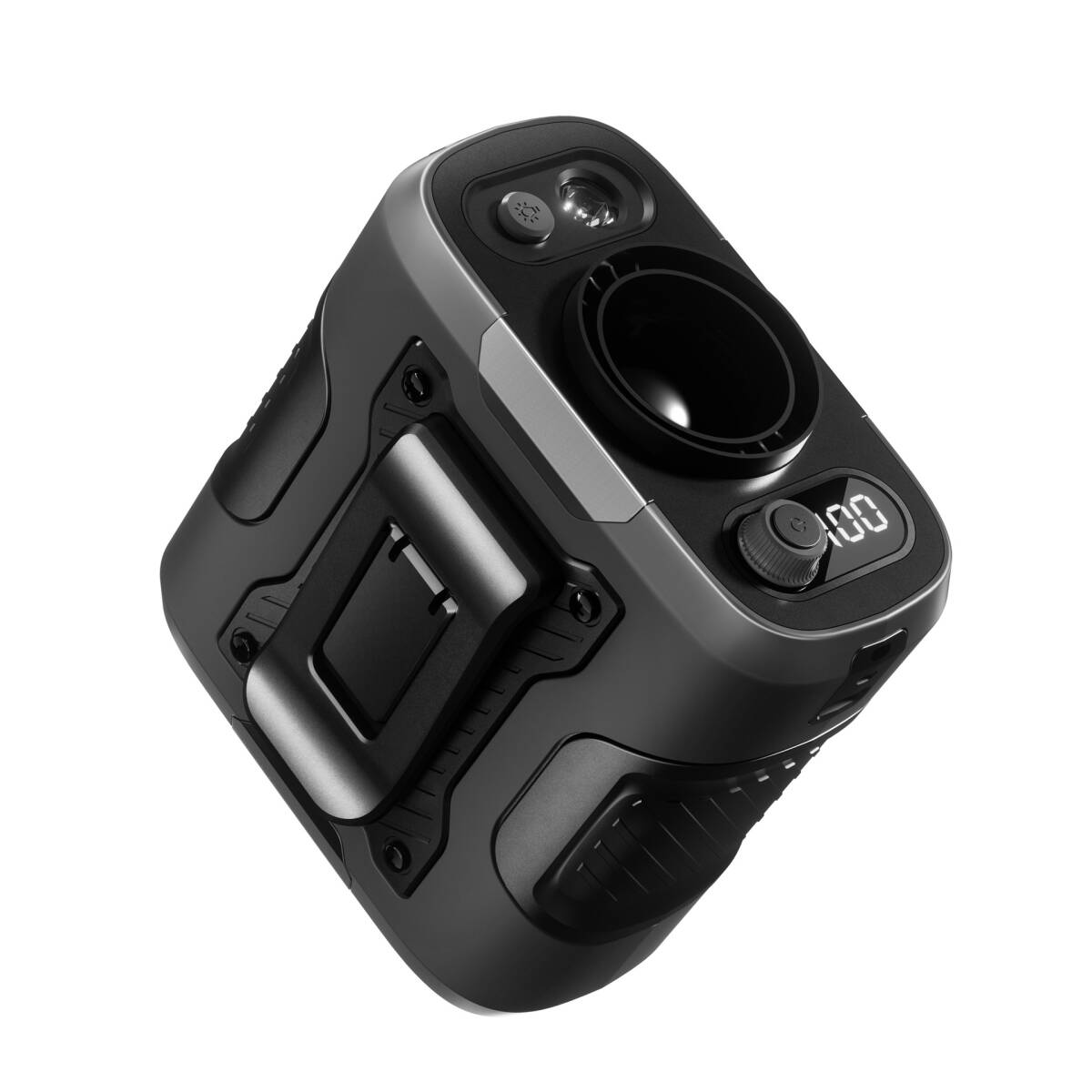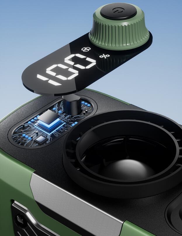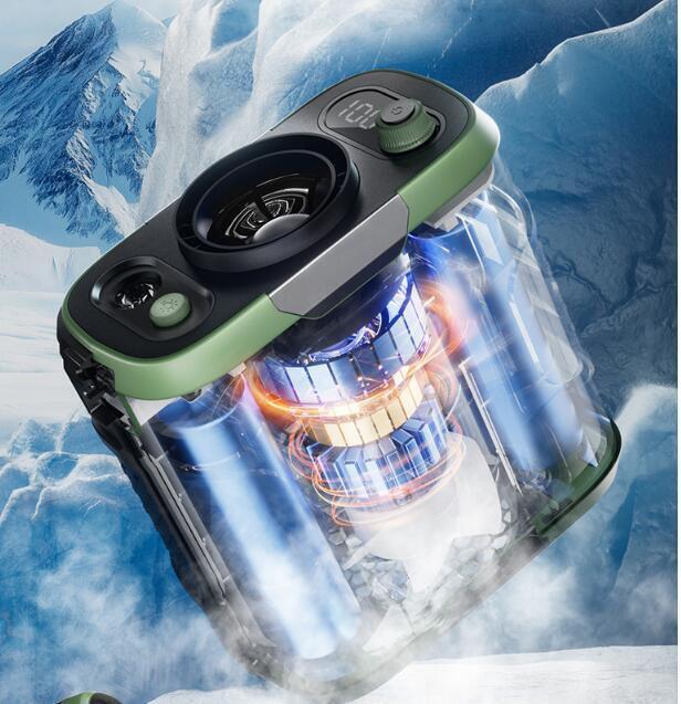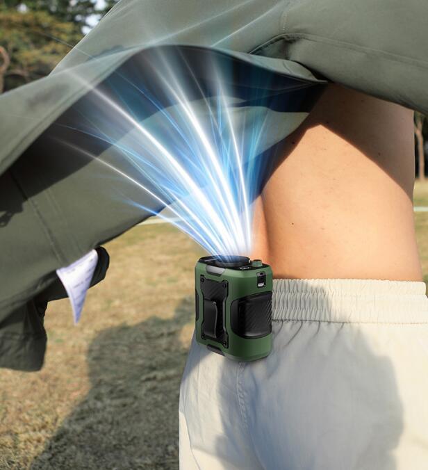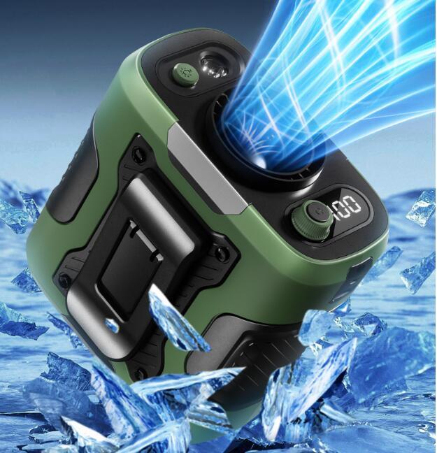 風力は通常の扇風機の10倍に達します。最大12M/Sな送風速度、13500RPM回転速度で3秒ほど360°全身が冷たい風に包まれます。内蔵の9000mAhリチウム電池、弱モードでは約24時間使用可能です。