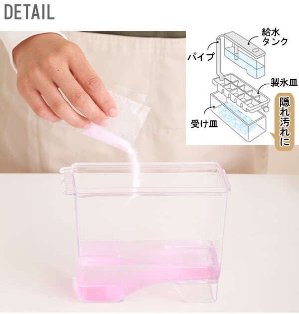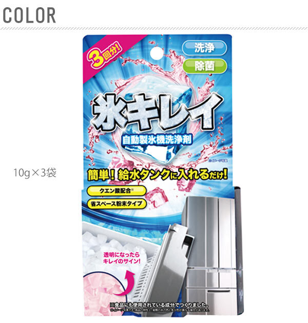 | 商品説明 | 自動製氷機の洗浄・除菌に♪給水タンクやパイプ、製氷皿など見えないところの汚れも簡単に洗浄!給水タンクに粉末を入れて溶かし、いつものように製氷するだけでOK!クエン酸がタンクやパイプ内を洗浄・除菌しながら通過し、細かい部分まで清潔にします。食品にも使われているクエン酸を使用しています。 |