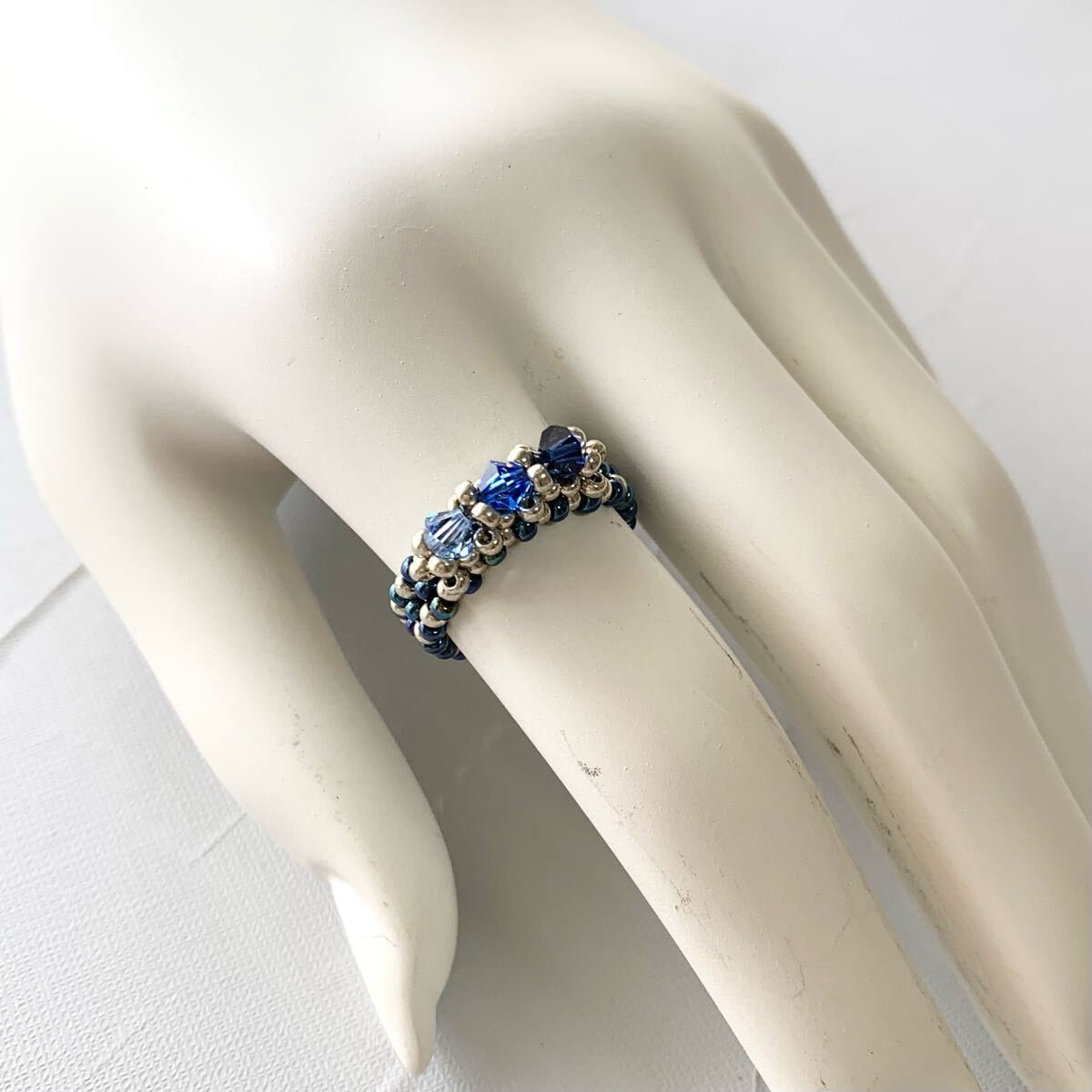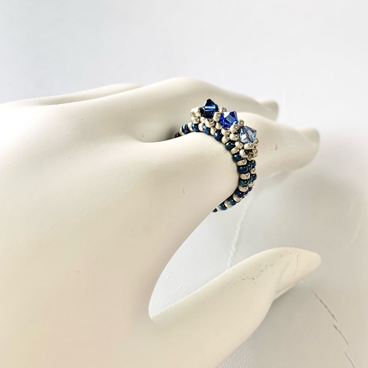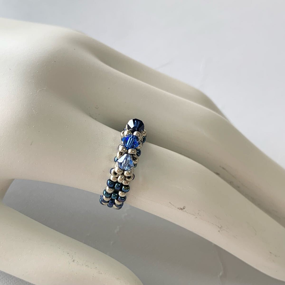 深みのあるブルーとシルバーのコントラストが美しいリングです。グラデーションにあしらったスワロフスキークリスタルビーズが光を浴びるたびに輝き、指元を華やかに彩ります。丁寧に編み上げたビーズのリングは指に優しくフィットし、様々なシーンでお使いいただけます。上品なデザインながらも存在感があり、お手持ちのアクセサリーとの重ね付けも楽しめます。ご自身へのご褒美に、大切な方へのプレゼントに、この煌めくリングはいかがですか?